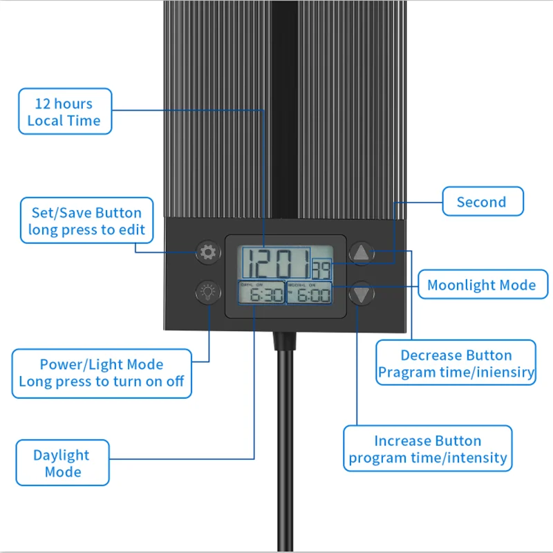 Работа ЖК-дисплея: Есть четыре функциональных клавиши, настройка режима/вверх/вниз/светильник. Основной экран в основном отображает местное время в режиме реального времени (дополнительно 12 часов/24 часа), время точно до секунды. Следующие два небольших экрана-это таймеры программ, которые раньше устанавливали время начала и окончания дня и ночи в режиме.