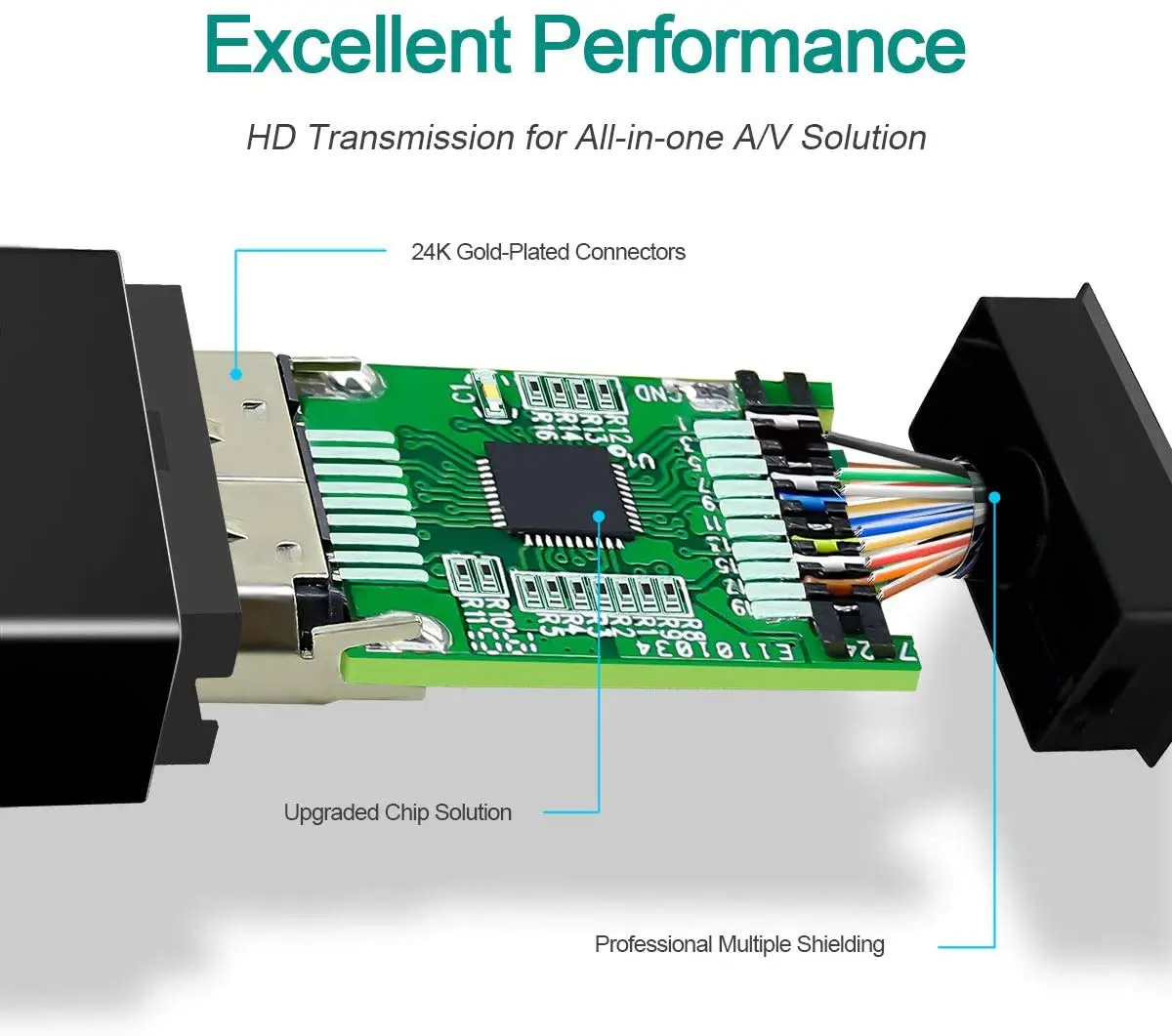 Передача HD для решения «Все в одном» A/V, позолоченные разъемы 24K, улучшенное решение для чипов и профессиональное многократное экранирование.