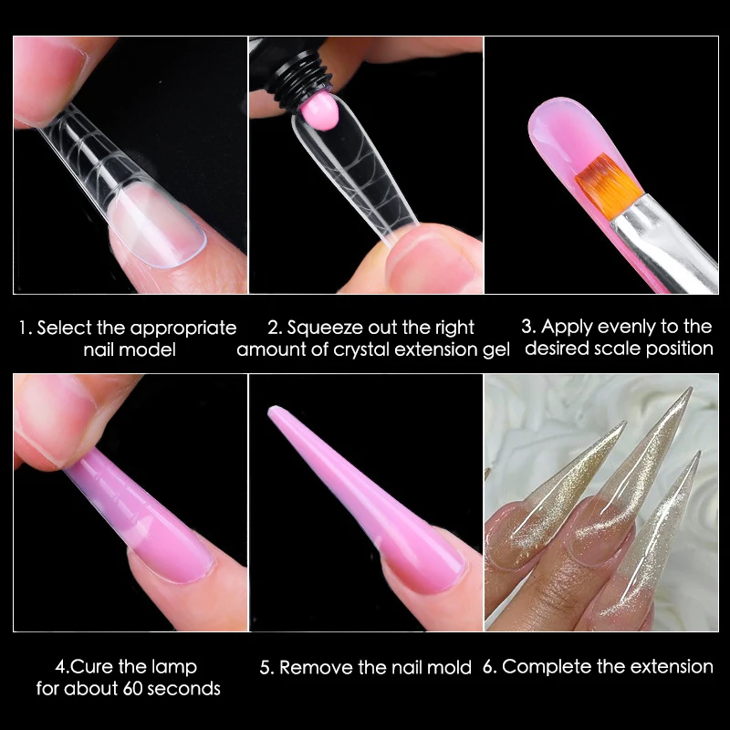 Метод наращивания ногтейИспользуйте советы по быстрому производству пресс-формПрофессиональное использование:1. Слегка нанесите поверхность ногтя2. Нанесите очень тонкий слой базового покрытия и закрепите его под УФ/светодиодной лампой.3. Выберите подходящую форму и размер накладных ногтей.4. Нанесите Удлинительный гель на формы для ногтей, используйте ручку для дизайна ногтей с очищающим средством, чтобы сделать гель гладким.5. Приклейте его к реальному ногтю и убедитесь, что он полностью разрастается, и высушите его под УФ/светодиодной лампой.6. Удалите накладные Кончики ногтей, обрежьте форму и отполируйте ногти.7. Нанесите верхнее покрытие и закрепите его под УФ/светодиодной лампой.8. Дизайн ногтей с вашими удовлетворенными узорами.