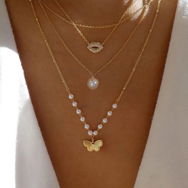 Винтажное многослойное жемчужное ожерелье с бабочкой для женщин, модное колье с золотым жемчугом и звездой солнца, 2021, тренд, ювелирное изделие, подарок