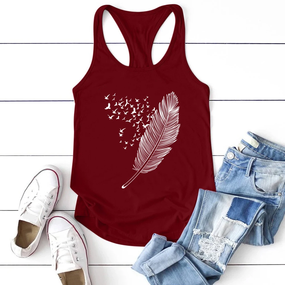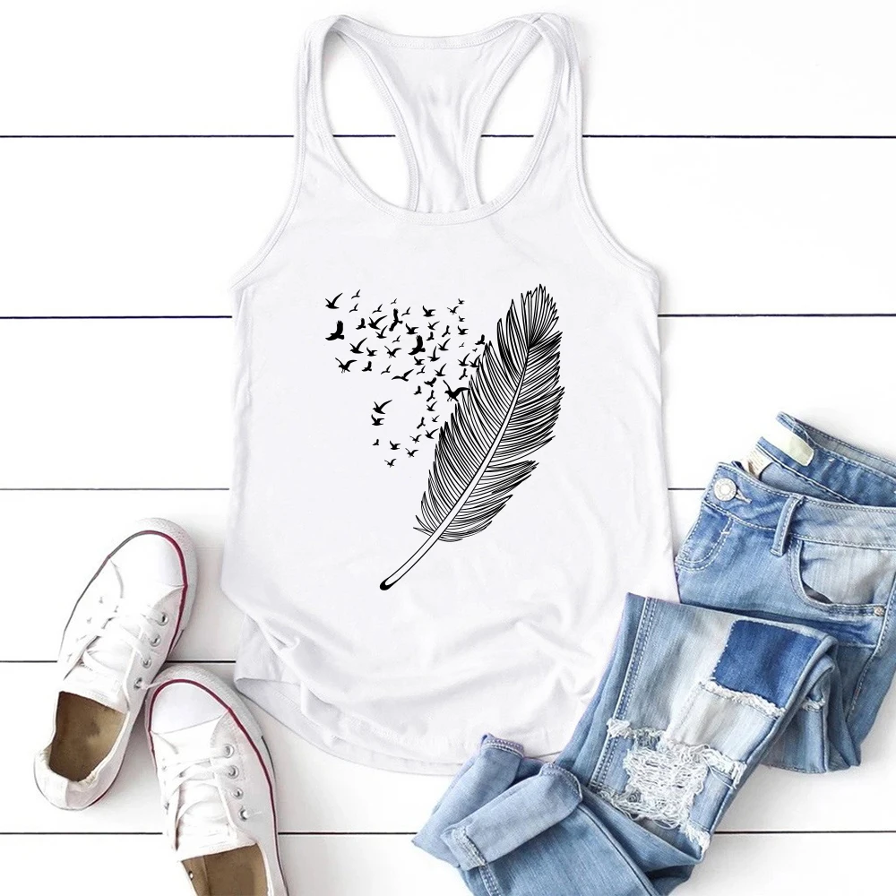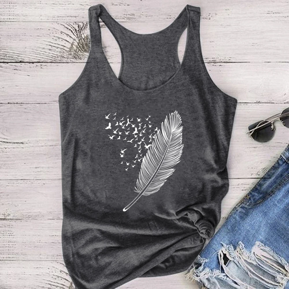 Женская Винтажная Майка с принтом перьев, летняя Свободная майка бе...