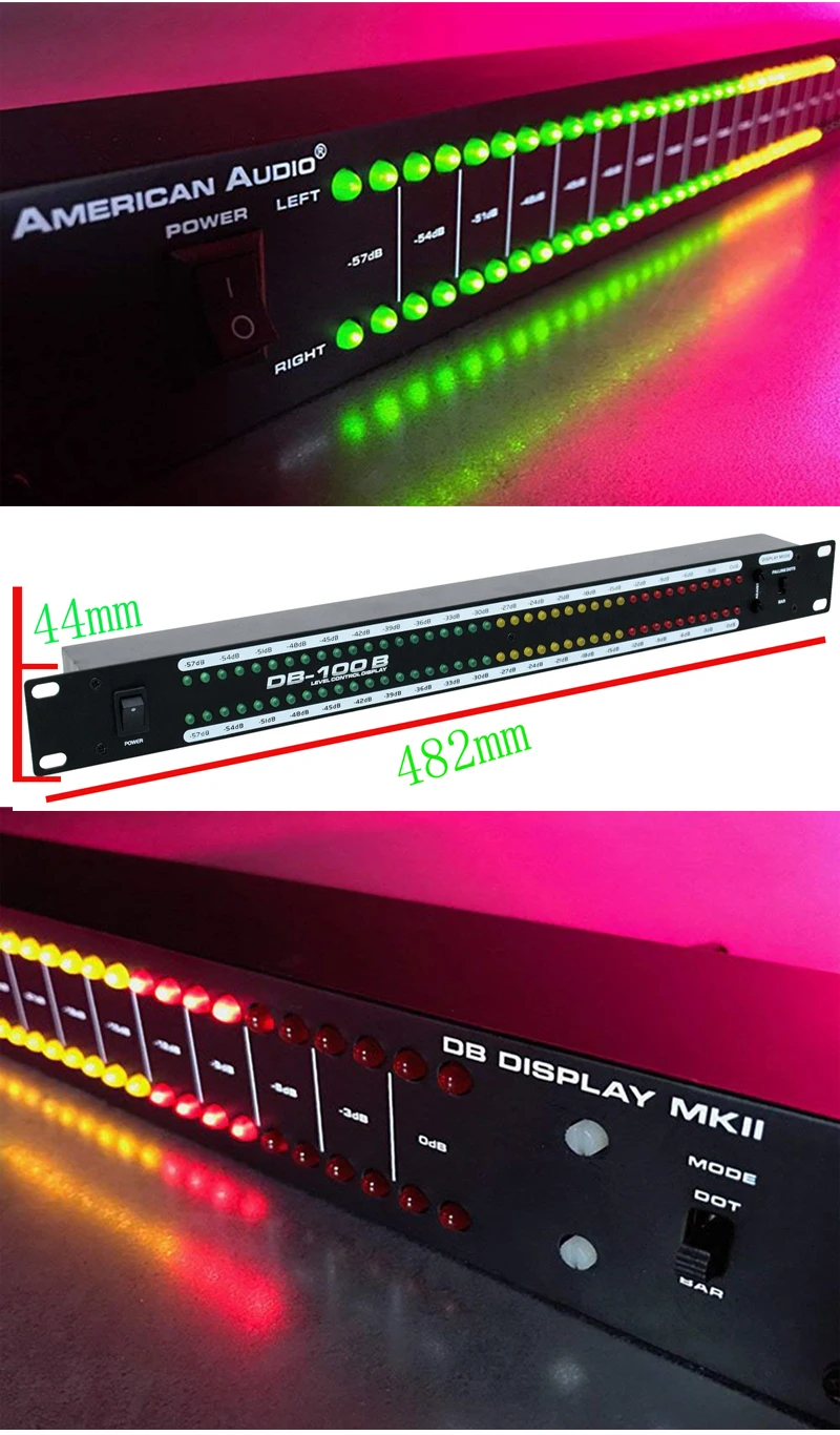 1. Двойной 40 светодиодов, трехцветный светодиодный дисплей, указывающий Размер аудиосигнала 2. Переключаемый режим отображения (отображение точки или гистограммы) DB100 (1-канальный стерео) Диапазон отображения: -57 дБ -- 0 дБ; DB200 (2-канальный стерео) Диапазон отображения: -27 дБ -- 0 дБ; 3. Управляйте дисплеем LE D на звуковом уровне 4. Мощность: 5 Вт (100-240 В переменного тока) 5. Размер: 482 × 44 × 40 см 6. Общий вес: 1,1 кг (включая упаковку)
