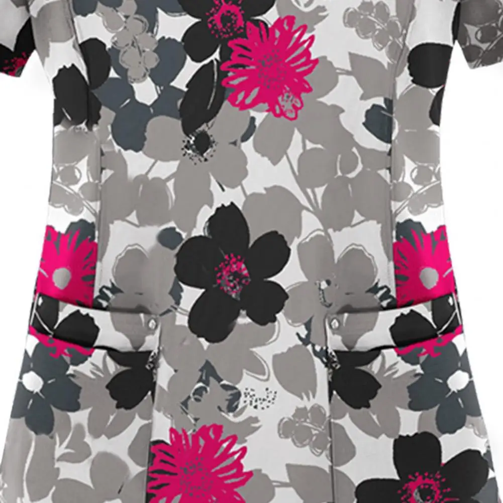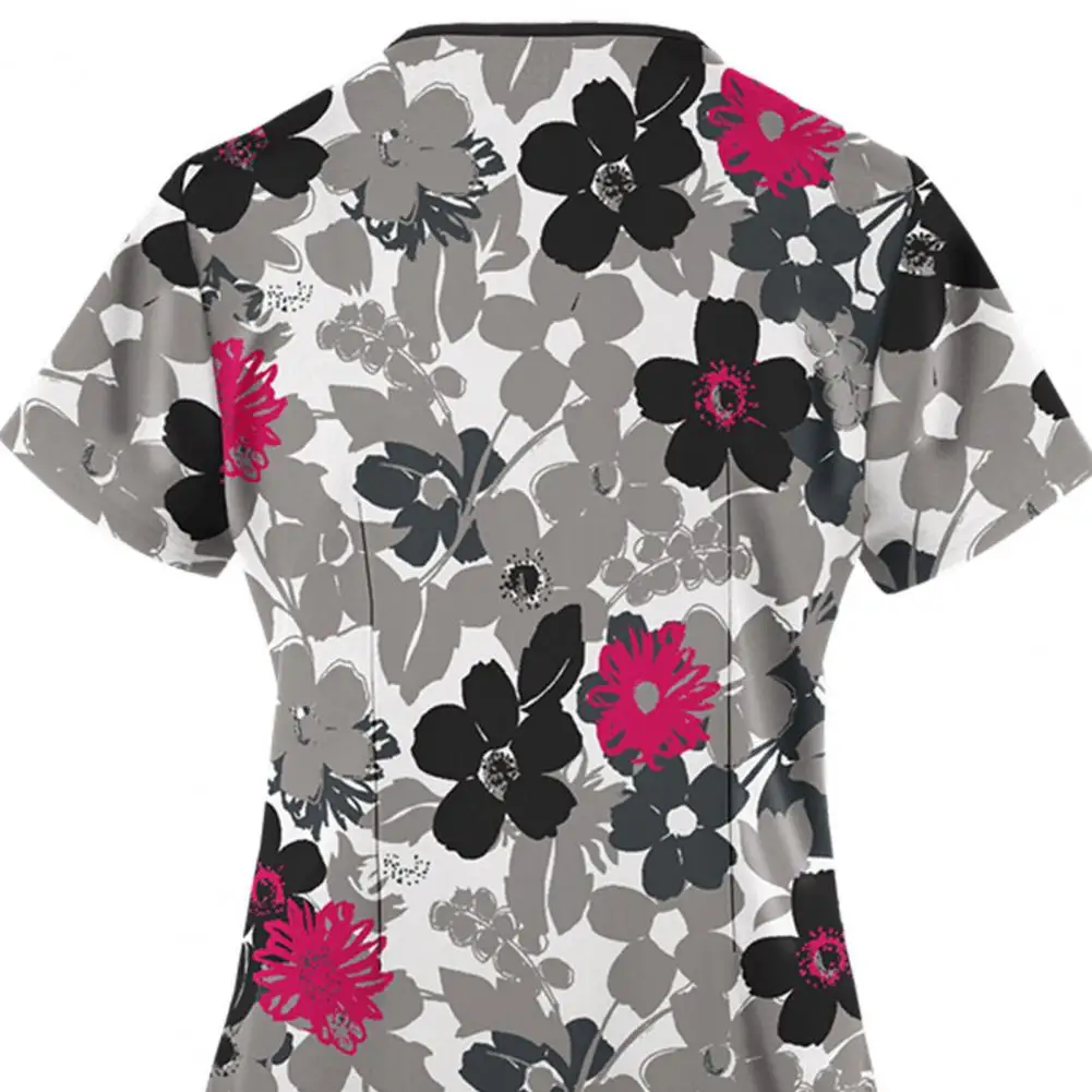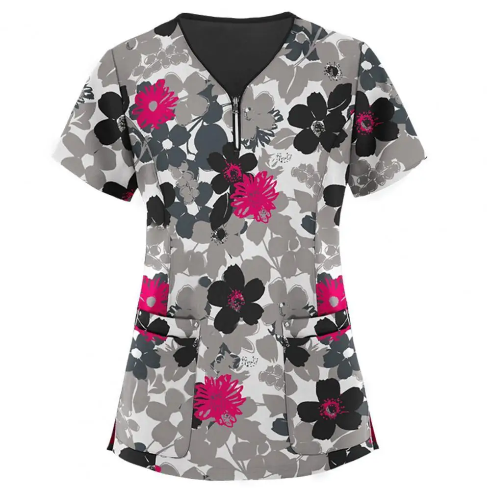 Женская свободная футболка с карманами, блузка с коротким рукавом и цветочным принтом листьев, рабочая форма для повседневной жизни, одежда медсестры, новинка 2021