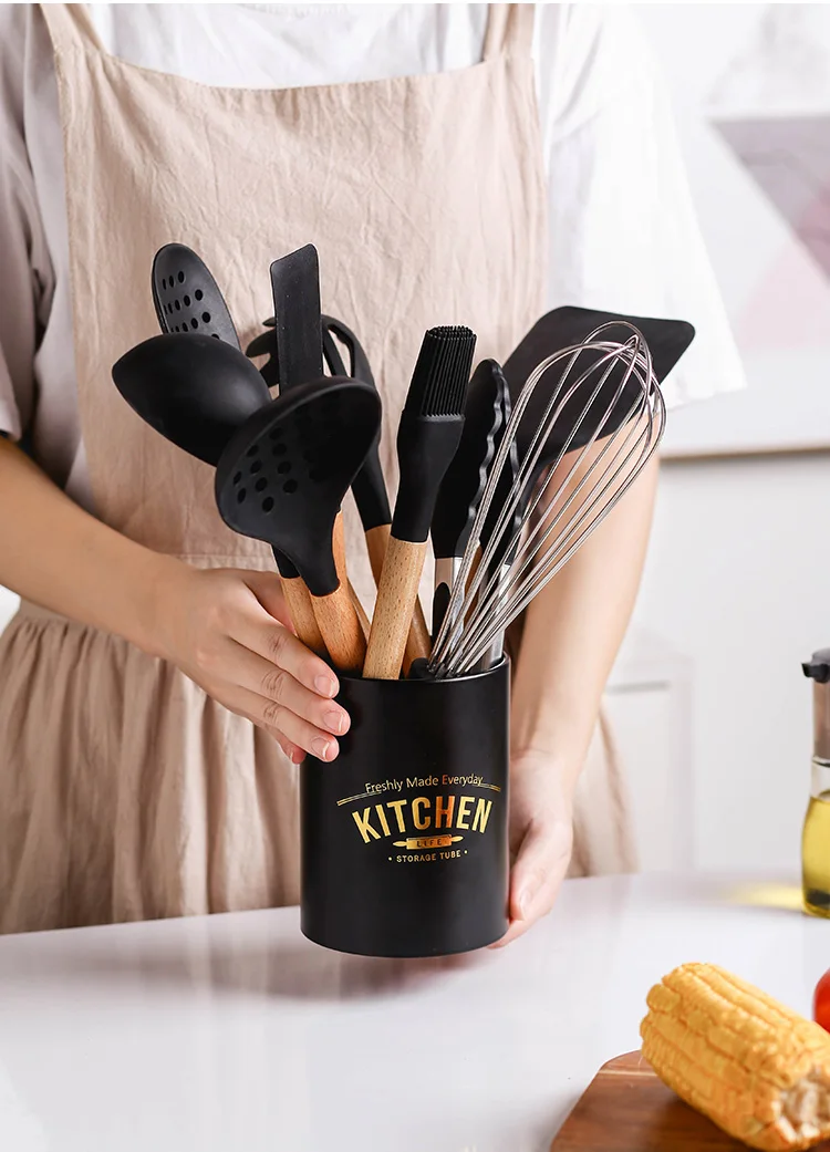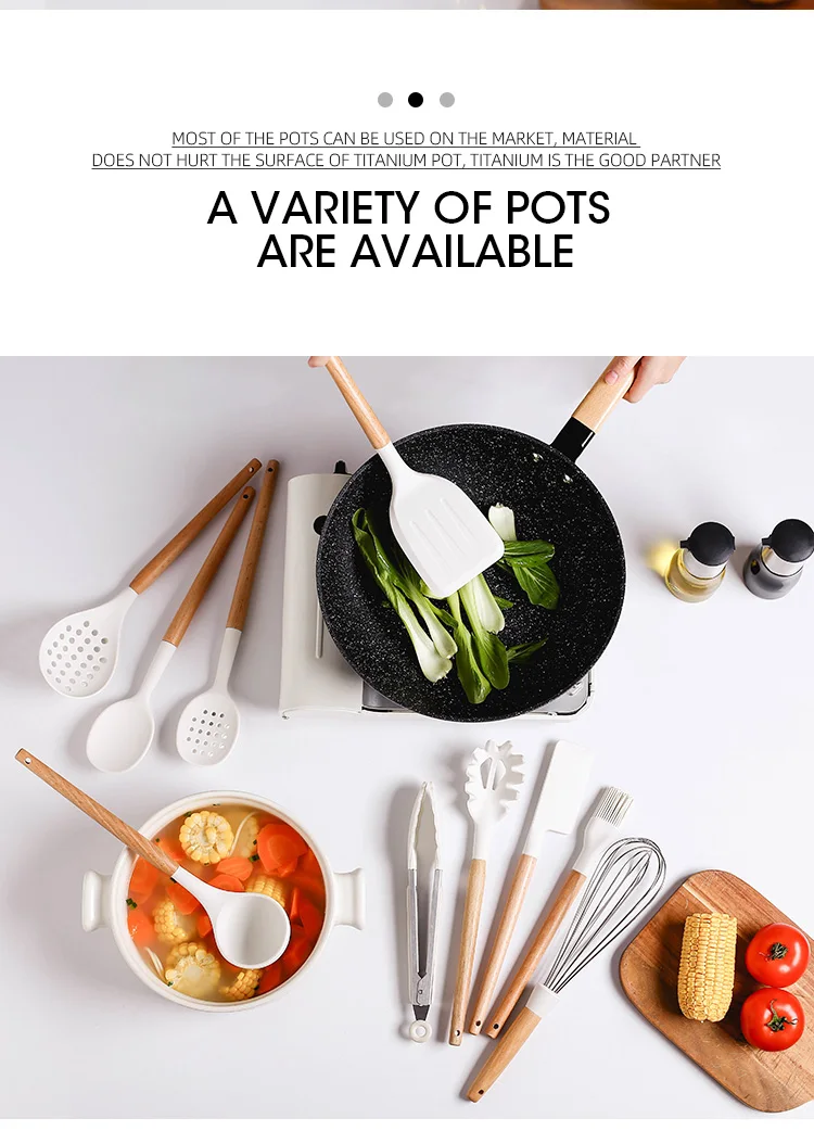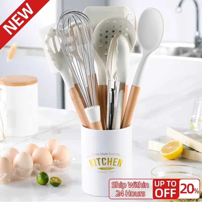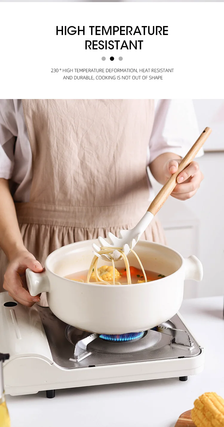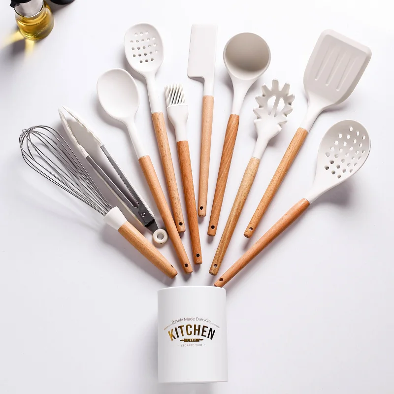 cucina для кухни кухонные аксессуары Набор силиконовых кухонных принадлежностей, антипригарная лопатка, ложка для супа, прищепка для баклажанов, деревянная ручка, контейнер для хранения, кухонный инструмент