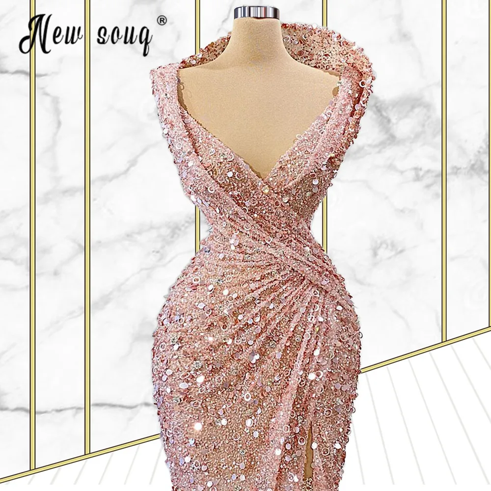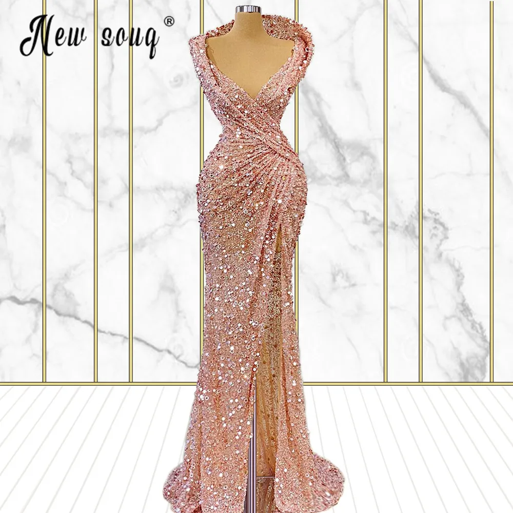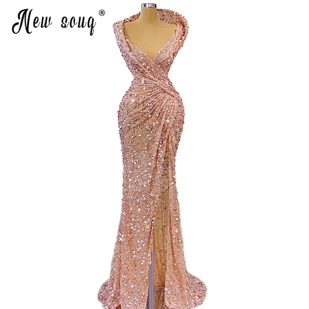 Карамельно-розового цвета, расшитые блестками вечерние платья с блестками Разделение сбоку женское Плиссированное длинное вечернее вечерние Макси платье для женщин Свадебная вечеринка вечерние торжественные платья