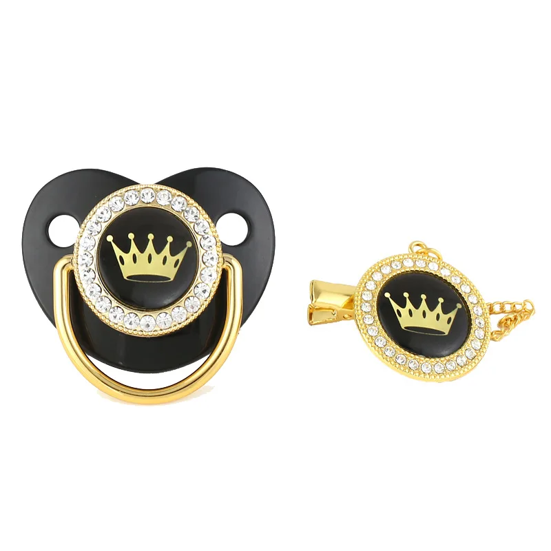 Черного и золотого цвета с блестками детская пустышка на цепочке с прищепкой с зажимом цепи BPA бесплатные силиконовые детские Стразы соска пустышки для младенцев, на возраст от 0 до 18 месяцев, подарок для новорожденных малышей