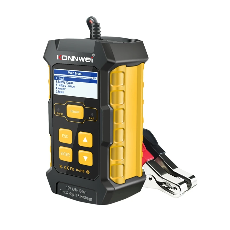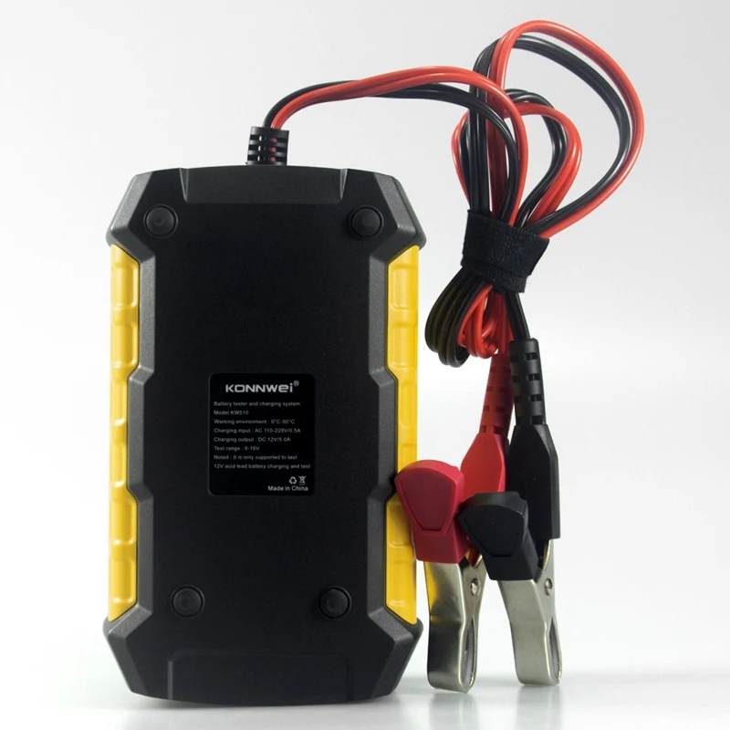 KONNWEI KW510-это профессиональный Тестер Аккумуляторов 3 в 1, зарядное устройство, устройство для обслуживания аккумуляторов (импульсный ремонт), зарядное устройство и устройство для проверки заряда батареи. Большой цветной ЖК-дисплей и функции, работающие на кнопках, будут более удобны по сравнению с другими аналогичными товарами.Работает годами, но не имеет представления о состоянии батареи? Тестер батареи KW510 12v обеспечивает общий анализ состояния батареи, проверяя его заряд напряжения, внутреннее сопротивление, а затем сообщает вам, нужно ли заряжать аккумулятор. Также этот тестер батареи проходит испытание системы подзарядки и зарядки и тестер автомобильного генератора зарядки.Заряжайте батареи до 2 вольт, максимальная выходная мощность 12 вольт 5 ампер. Зарядное устройство KW510 не только помогает заряжать батареи, но и адаптирует новейшую технологию импульсного ремонта, ремонт одним нажатием кнопки и автоматически обнаруживает сульфат батареи и расслоение кислоты, чтобы вернуть батареи к жизни и восстановить их производительность.KW510 может проверить, Мы произведем и ремонт всех 12-вольтовой 100-2000CCA свинцово-кислотных аккумуляторных батарей в том числе обычный свинцово-AGM плоская пластина, AGM спираль или аккумуляторная коллоидная батарея. Идеальный тестер автомобильного аккумулятора для диагностики батарей автомобилей, лодок, газонокосилок и т. д.Безопасная зарядка-это самое главное! За исключением умной компенсации температуры, которая подходит для всех климатических условий и автоматического изменения в режиме низкого тока после полной зарядки, KW510 также поддерживает до 8 видов защиты, таких как обратная полярность, перегрузка, перегрузки по току, перегрев, система охлаждения, огнеупорный материал, защита от короткого замыкания и т. д.Поддержка 8 языков: английский, французский, немецкий, голландский, испанский, португальский, русский и итальянскийKW510 автомобильный тестер батареи Применение:Все 12V свинцово-кислотная батарея бензина, сырая нефть, гибридные электрические автомобили и аварийные аккумуляторы.Стандарт автомобильного аккумулятора:CCA:100-2000BCI:100-2000CA:100-2000MCA:100-2000JIS:26A17-245H52DIN:100-1400IEC:100-1400EN:100-2000SAE:100-2000Тип штепсельной вилки: штепсельная вилка Великобритании, применяется в Малайзии, Великобритании и так далее.Цвет: как показаноМатериал: АБС-пластикПосылка:1 * зарядное устройство KW5101 * зарядный кабель1 * руководство на английском языкеТолько вышеуказанная посылка, другие товары не включены.Примечание: светильник и различные дисплеи могут привести к тому, что цвет товара на картинке немного отличается от реального. Допускается погрешность в измерениях +/- 1-3 см.