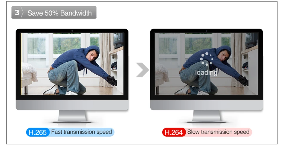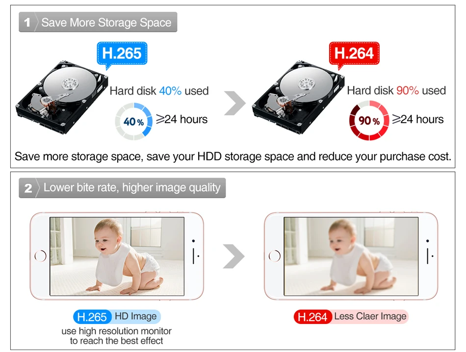 H.265 более четкий, HD разрешение предлагает вам лучшее качество изображения в более низкой скорости.