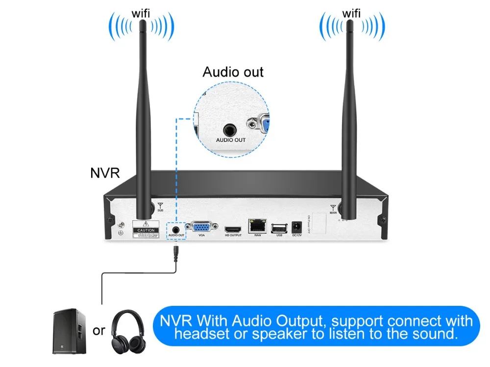 NVR с аудиовыходом, поддержка подключения к гарнитуре или динамику для прослушивания звука.
