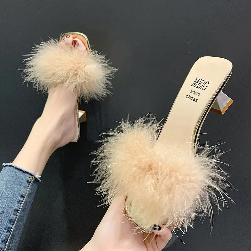 Летняя обувь, женские меховые шлепанцы на тонком высоком каблуке с ...