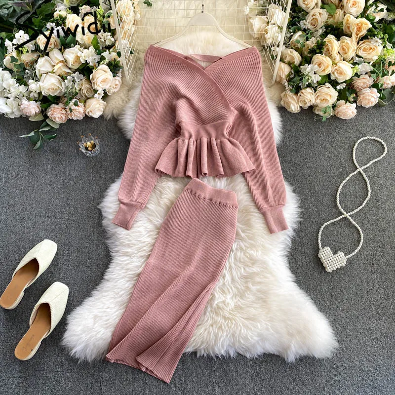 Syiwidii комплект из 2 предметов, вязаные юбки, женские летние 2021 рубашки с длинным рукавом и v-образным вырезом, эластичная резинка на талии, узкая юбка средней длины, розовый, зеленый, синий цвета
