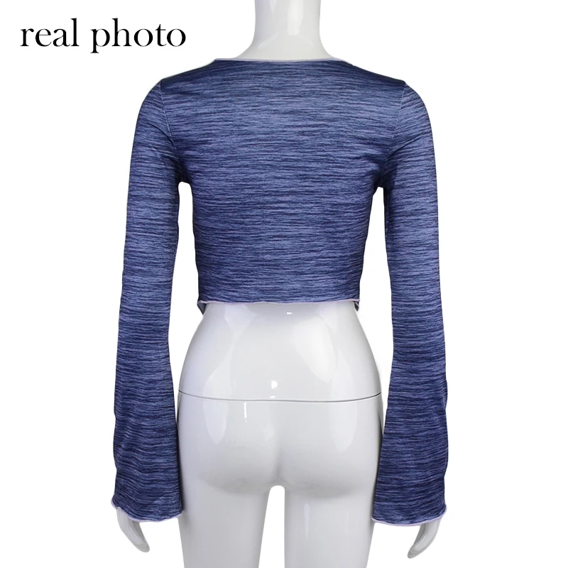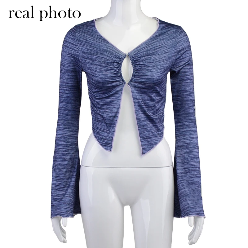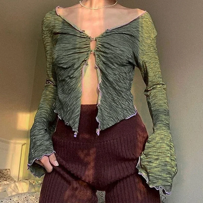 Уличная одежда Y2K EGIRL Fairycore Y2K, футболки с V-образным вырезом и расклешенными рукавами, винтажный пикантный укороченный топ для E-girl с пуговицами и разрезом, ажурная зеленая футболка