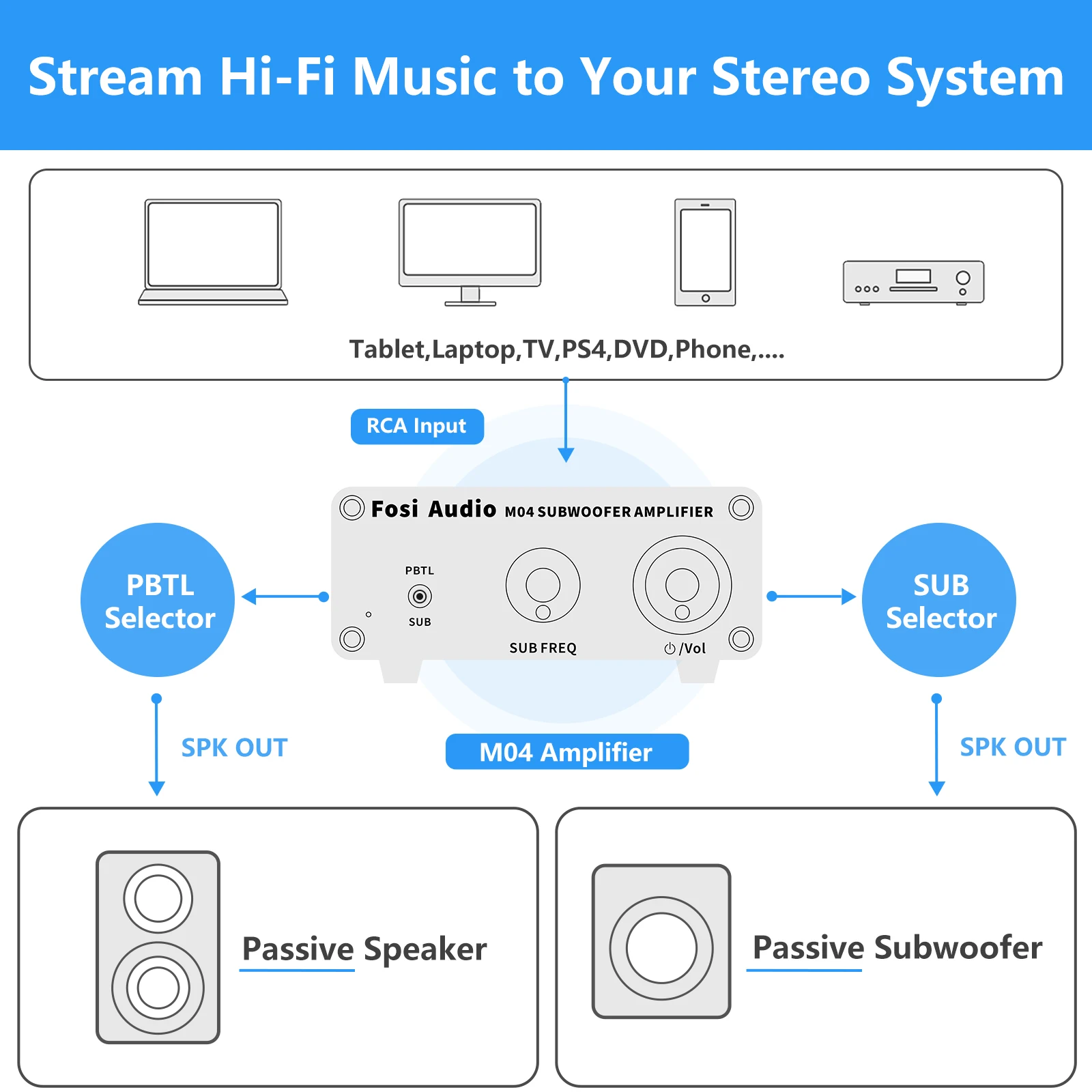 Маленький, но могучий! Fosi Audio M04-это моноканальный усилитель сабвуфера класса D 100 Вт, с переключателем SUB/PBTL, вы можете выбрать сабвуфер, усилитель басов или моноусилитель полной частоты, может быть подключен к активному/пассивному сабвуферу и пассивному