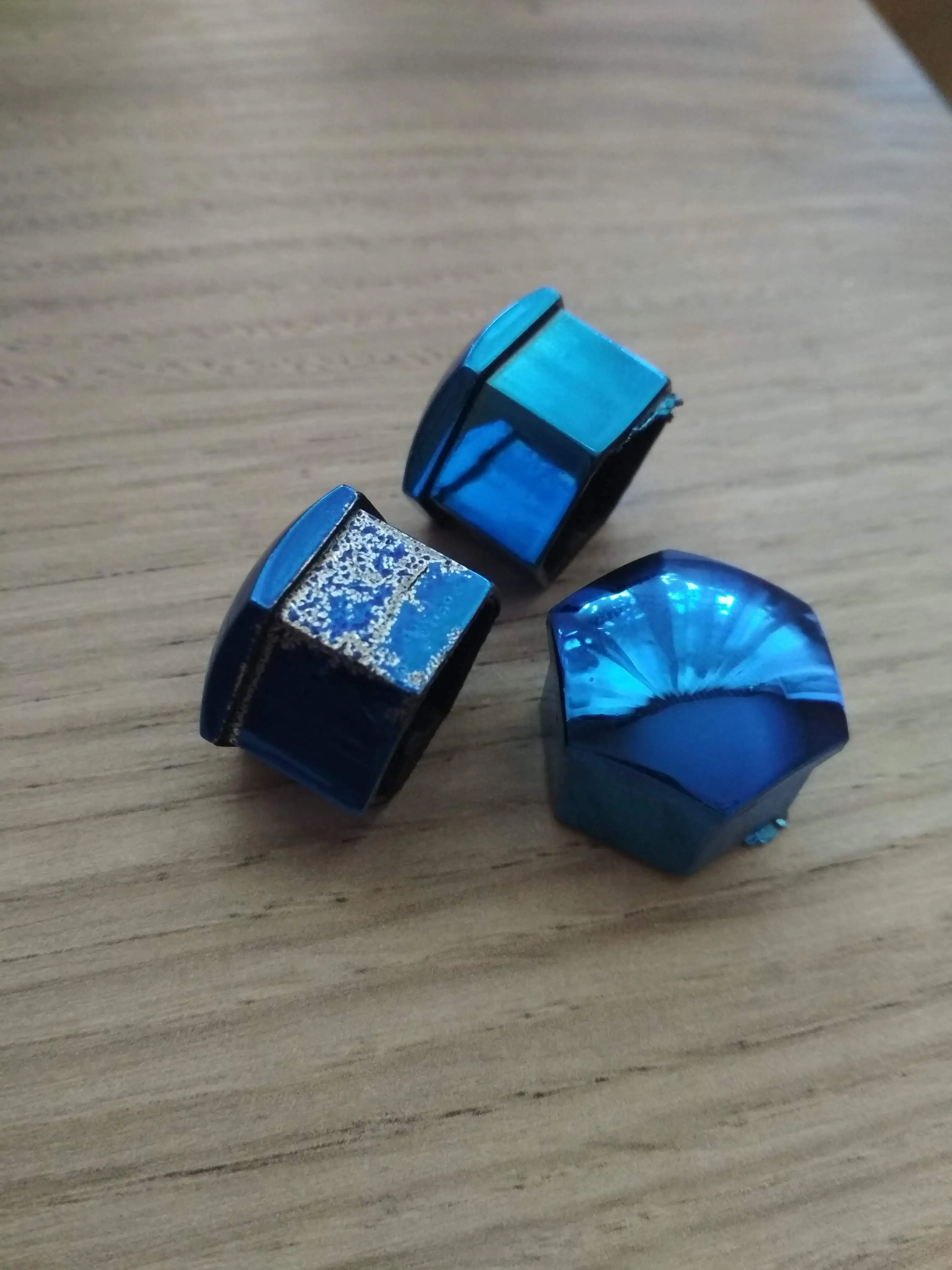 Ковпачки пластикові. Деякі з них мають нерівномірне напилення фарби, або браковане її нанесення з прогалинами. В цілому, за свої гроші - нормально.