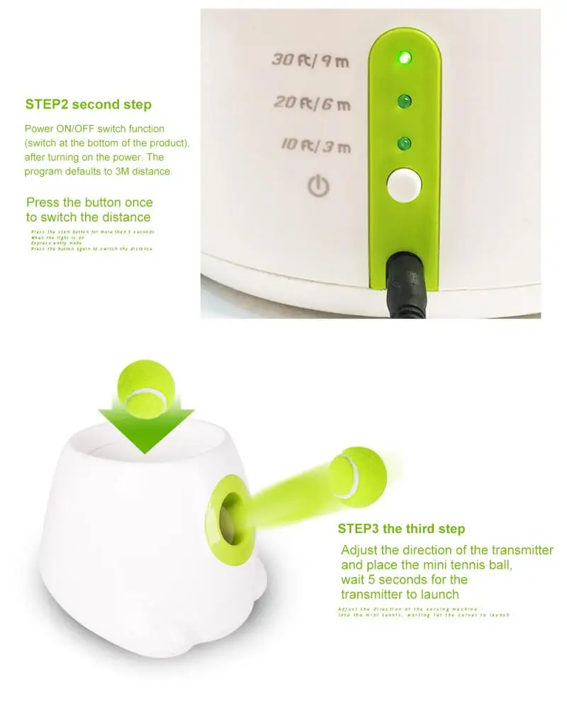 Регулируемое расстояние запуска: устройство для запуска мяча может запускать мяч на 10, 20 или 30 футов, который может быть легко изменен нажатием кнопки.
