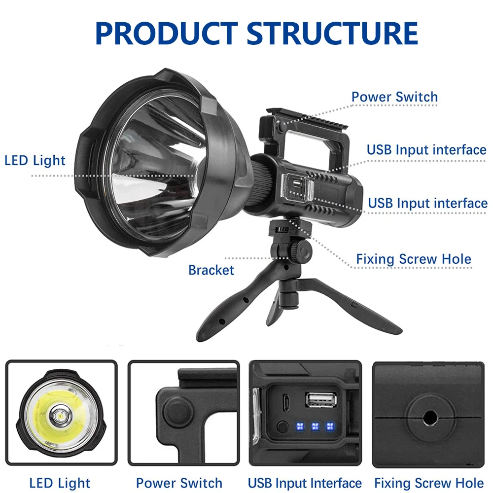 * Многофункциональный: супер яркие фары, большое расстояние освещения и большие расстояния. Может использоваться в качестве прожектора, кемпинга, рабочего света и т. Д.