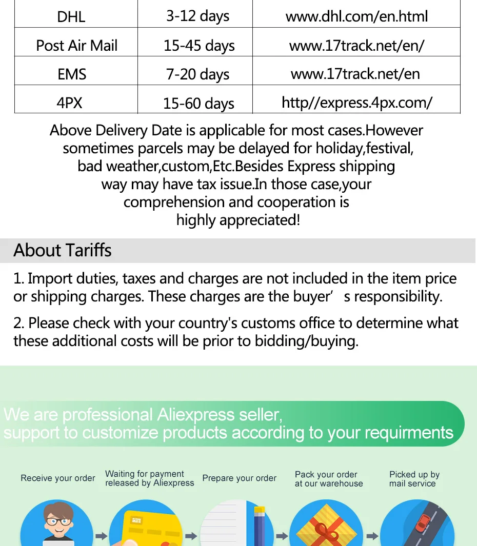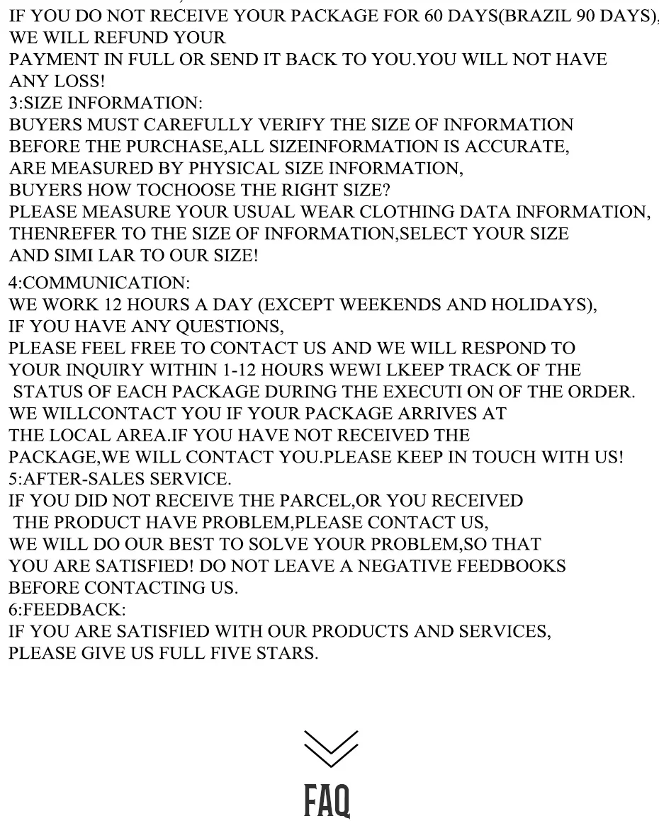 5. Если вы не получили товар в течение 30 дней после оплаты, пожалуйста, свяжитесь с нами. Наша платформа будет работать с ним как можно скорее, чтобы помочь вам отслеживать его. Наша цель-ваше удовлетворение!