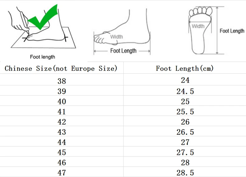1. Наш размер-китайский, а не Европейский, они отличаются по стандартам.В Китае только длина стопы может помочь вам купить правильный размер, поэтому перед размещением заказа, пожалуйста, внимательно Измерьте «длину стопы», как на фото ниже.2. Не измеряйте «длину подошвы» и «длину стельки», иначе вы ошиблись размером.3. Если у вас широкая или полная стопа, вы можете купить больший размер.