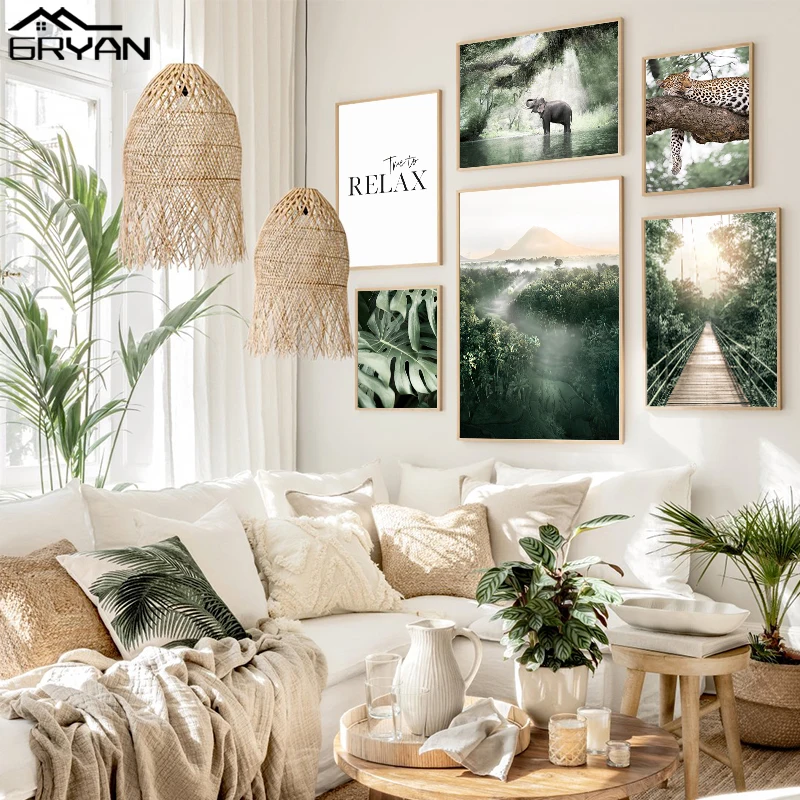 Пейзаж джунглей, холст, плакат, животное, леопард, слон, принт, Пальмовые Листья, лес, река, мост, скандинавский рисунок, украшение