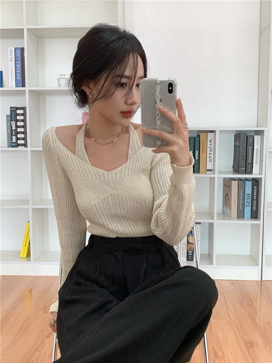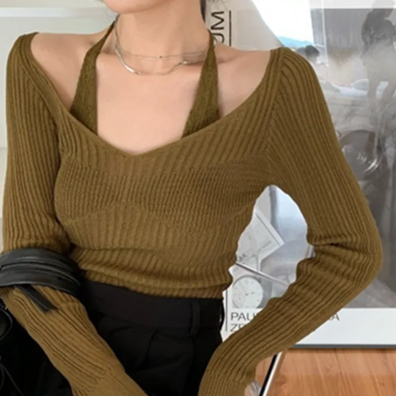 2021 комплект из двух предметов с лямкой на шее белый свитер Осенняя женская обувь 2021, новинка, длинный рукав, тонкий плотный свитер с пышным рукавом, Топ