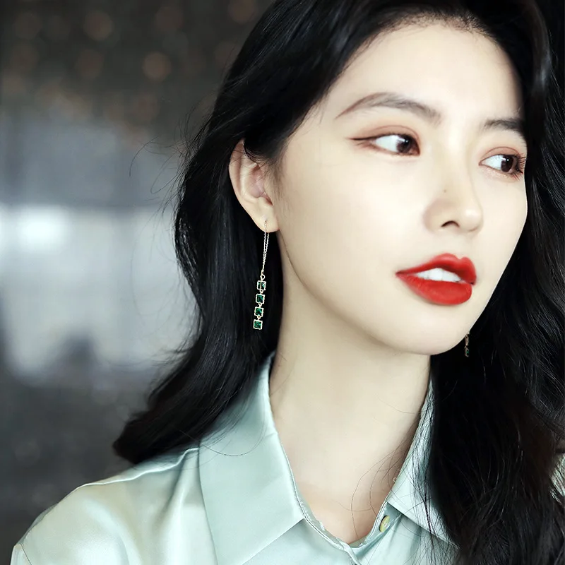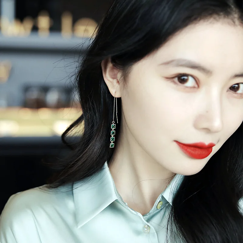 Происхождение, в Корейском стиле; Сезон лето Модные зеленой площади геометрические свисающие серьги для женщин с длинной бахромой стразы, серьги, ювелирное изделие, модные серьги в форме