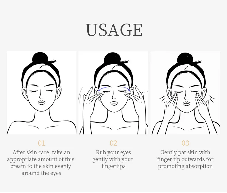 После очищения лица нанесите 0,5g для ухода за областью вокруг глаз ровным слоем на кожу вокруг глаз, в то время, мягко массируйте круговыми движениями до полного впитывания. Применение два раза в день утром и вечером.