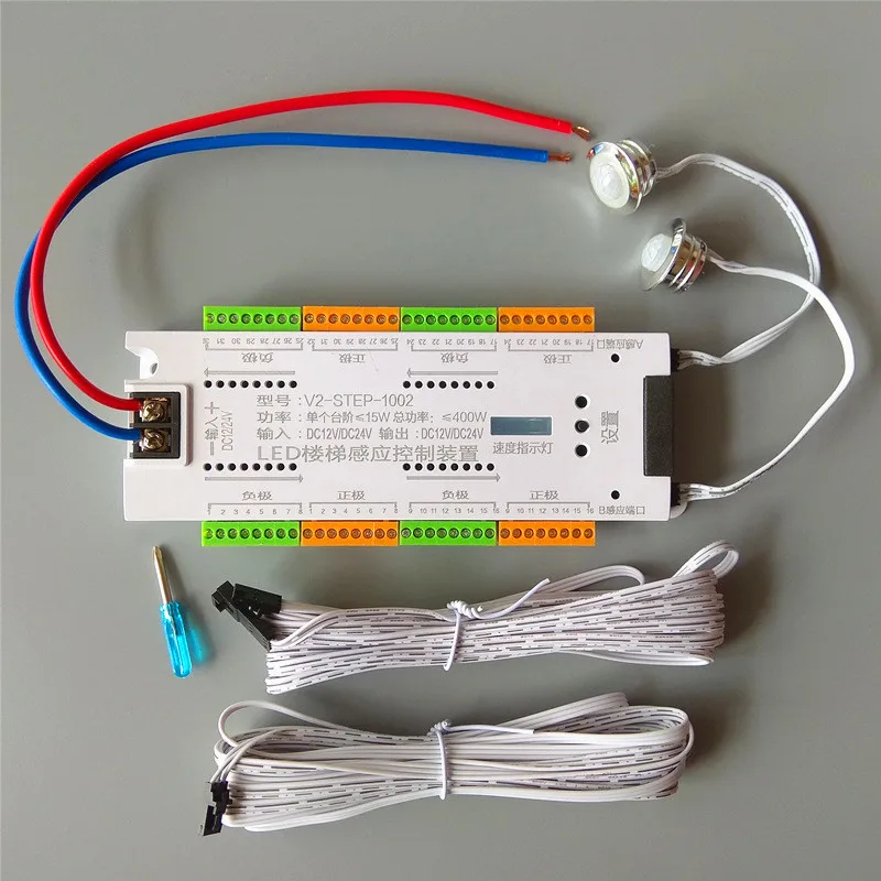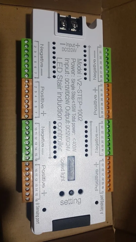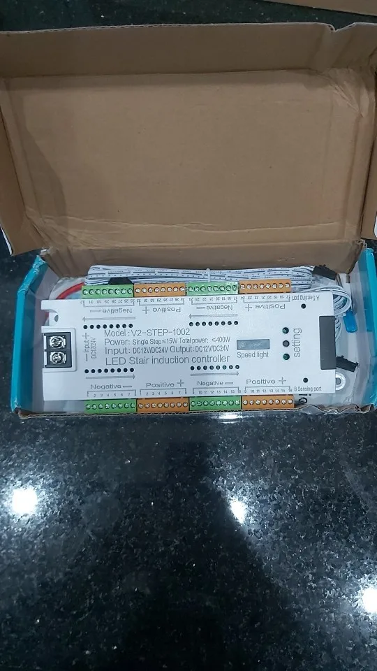 Для подсветки лестницы брали контроллер на 12v и светильники на 12v. Блок питания докупали отдельно. Пришло раньше срока, все работает. Есть возможность задать скорость загорания (чтобы светильники включались по очереди). На самой маленькой скорости включаются с очень маленьким интервалом, поэтому подключали к контроллеру через один (у нас 12 светильников, 32 входа). Контроллер подходит не только для светодиодной ленты.
