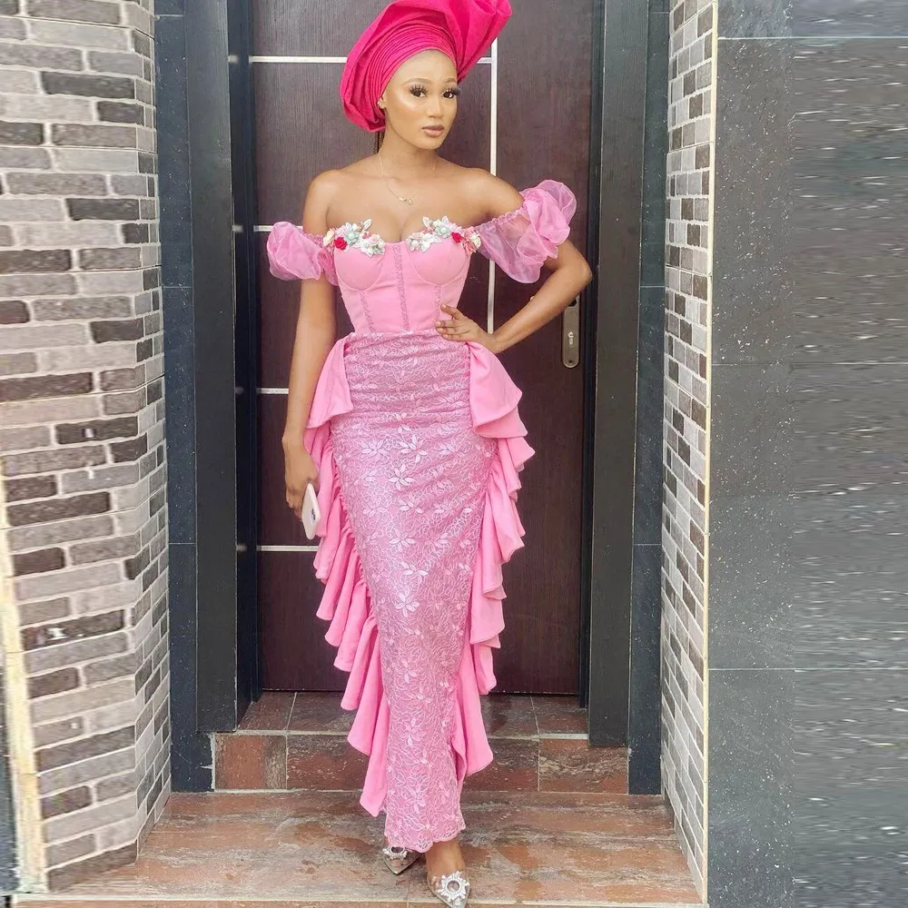 Aso Ebi русалка розовые платья для выпускного с открытыми плечами кружевное вечернее платье Африканское гофрированные манжетки; Аппликации; Длина в африканском стиле; Вечерние платья