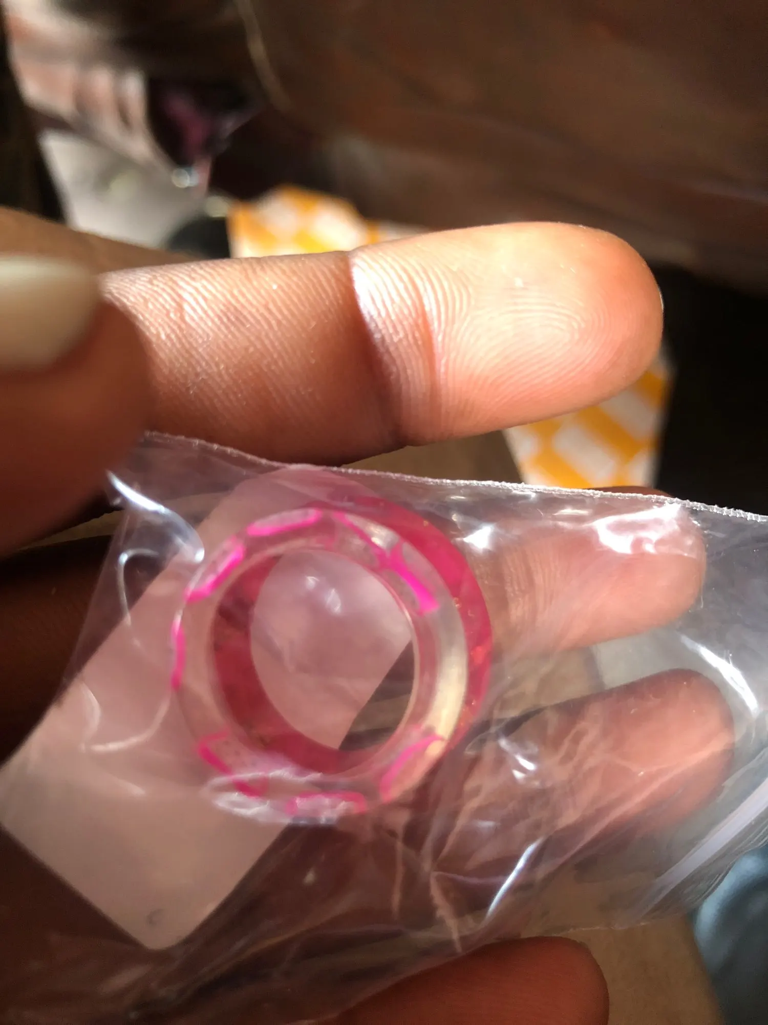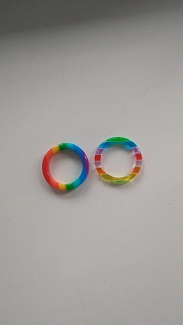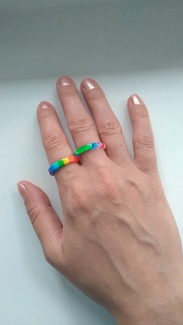 кольца меньше чем там написано, по размерам которые тут, радужный должен надеваться на безымянный палец, но это получается с трудом, он спокойно надевается на мизинец, а прозрачное должно было на средний, но как и радужной надевается на другой, безымянный, немного не приятно, но товар качественный, просто внимательнее смотрите на размеры