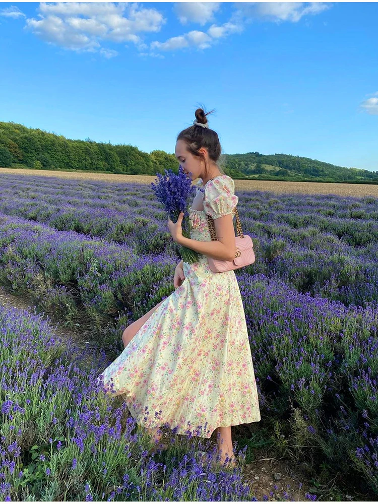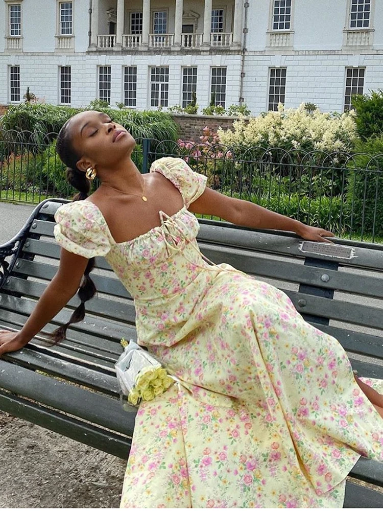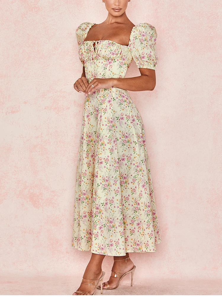 Цветочный принт платье Новый Азии сладкий с квадратным вырезом с буфами на рукавах сторона Пролитая шнурок макси платья для женщин в африканском стиле Вечерние шикарные повседневные наряды