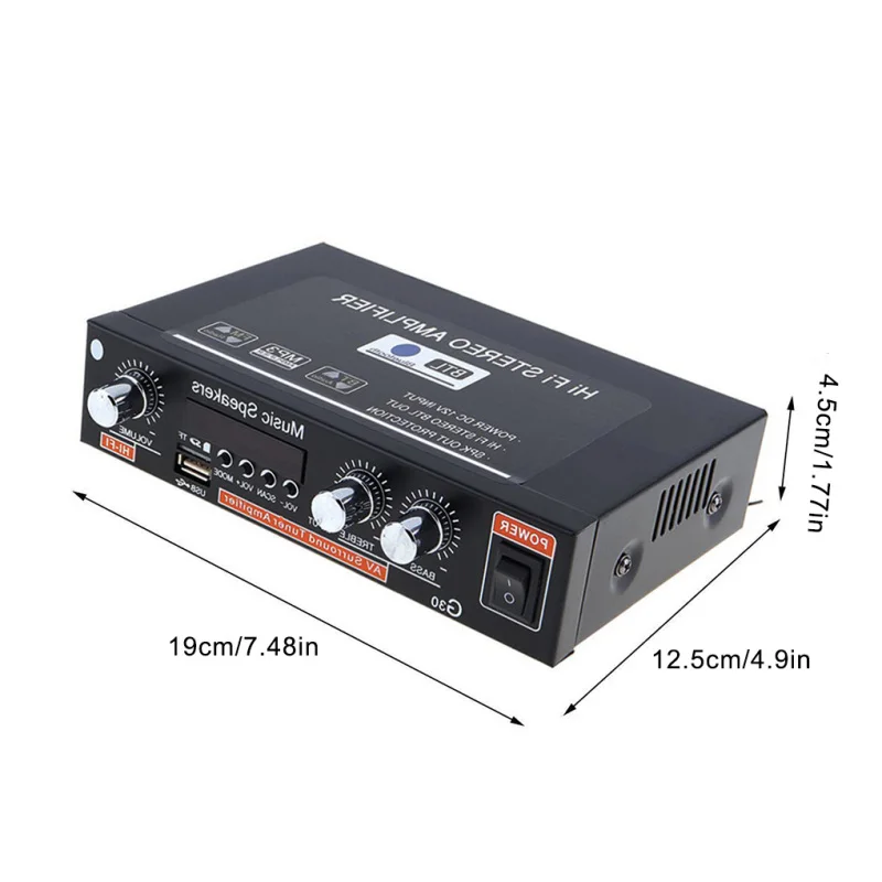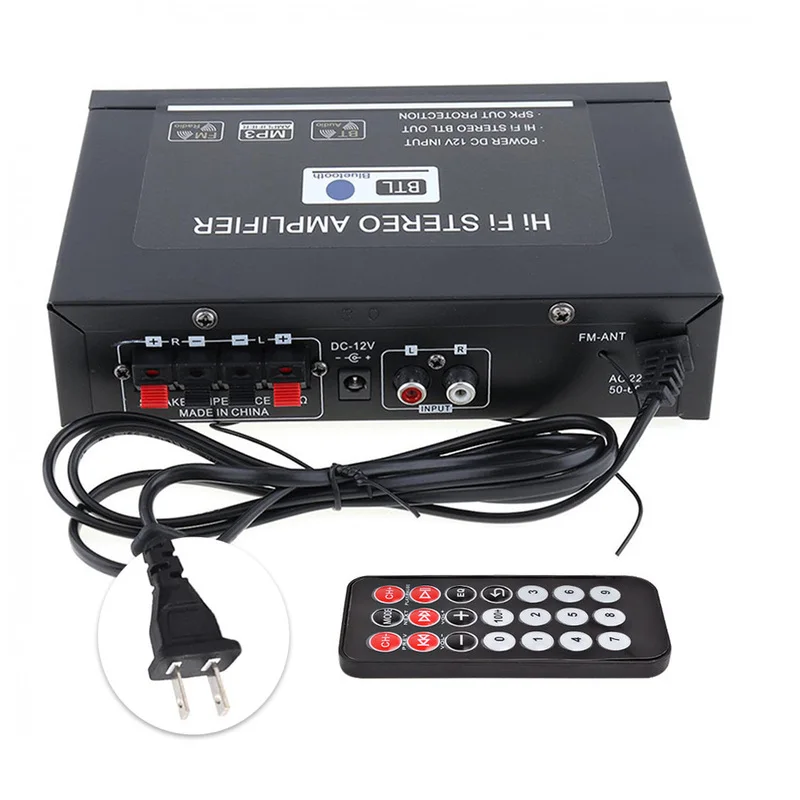 Этот усилитель мощности стерео радио поддерживает беспроводное соединение bluetooth и поддерживает tf-карту, AUX и u-диск.