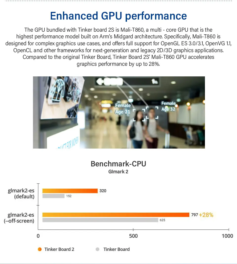 Графический процессор в комплекте с Tinker board 2-это Mali-T860, многоядерный графический процессор, который является высокопроизводительной моделью, построенной на архитектуре Arm Midgard. В частности, Mali-T860 предназначен для сложных графических чехлов и обеспечивает полную поддержку OpenGL ES 3,0/3,1, OpenVG 1,1, openCL и другие рамки для следующего поколения и старых 2D/3D графических приложений. По сравнению с оригинальной платой Tinker, Mali-T860 графический процессор Tinker Board 2 ускоряет графическую производительность до 28%.