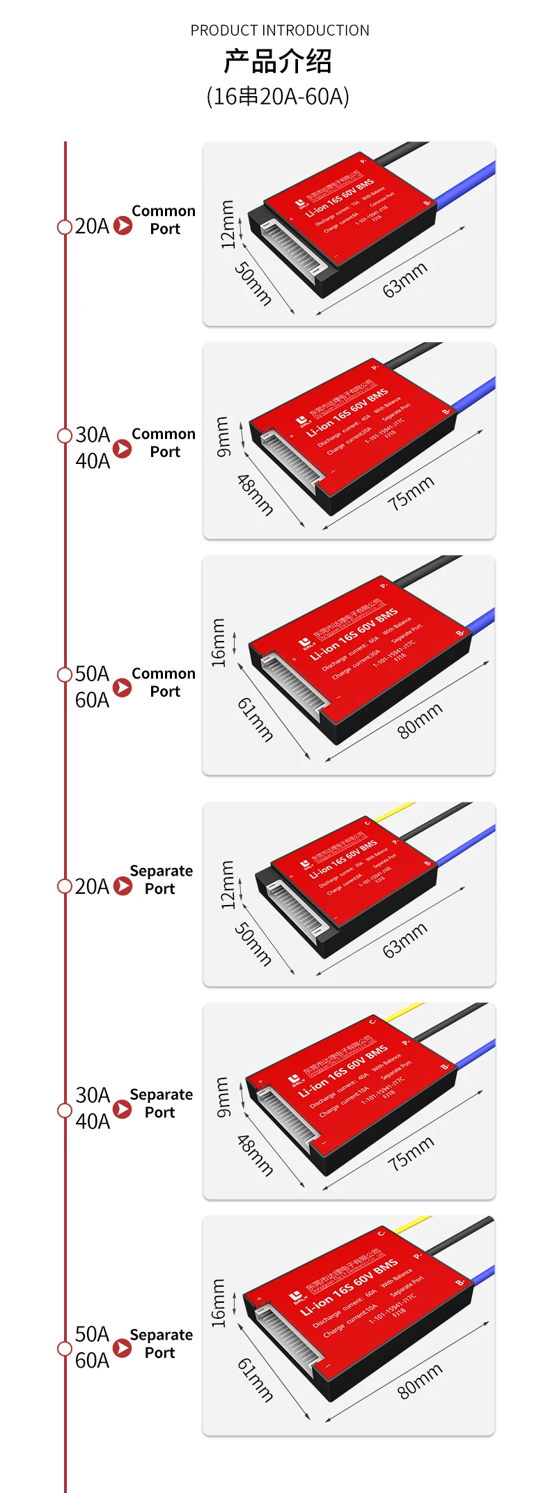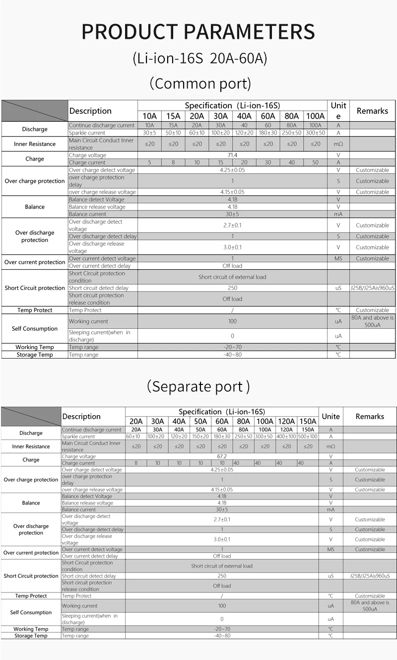 Daly BMS для Li-Ion 16S 60V 15A 20A 30A 40A 60A 18650 PCM литиевая батарея Защитная плата BMS PCM со сбалансированнымМодель: DL16S (3,7 В Номинальная Li-Ion Батарея не для 3,2 В Номинальная LiFePO4)Общая версия: общий порт для зарядки/разрядкиОтдельная версия: отдельный порт для зарядки/разрядкиМы можем настроить любой PCB от 1S до 32S литиевых батарей с разным током. Изюминка: для той же модели ток заряда меньше, чем ток разряда, потому что Daly PCBAs были обновлены, чтобы хорошо защитить батарею клиента. По любому запросу, пожалуйста, свяжитесь с нами. 1. Обзор◆ DL16S 60V 15A 20A 30A 40A 50A 60A bms используется для аккумуляторной батареи серии 16 60V.◆Мы можем спроектировать его для различных литиевых батарей, таких как LiFepo4, LiMn2O4, Li-polymer и т. д.◆Основные функции: защита от перезарядки, защита от разрядки, защита от перегрузки по току, защита от короткого замыкания, защита от температуры и т. д.◆В соответствии с запросом клиента мы можем разработать PCM различных размеров и конструкций.◆BMS изготовлено высококачественными Mos и IC импортированными. Храните аккумулятор в течение длительного цикла. 2. Преимущество◆Используйте высококачественный (A-level) защитный интегральный замыкание IC, от решения Seiko из Японии.◆Сильный нагрузочная способность, постоянная разрядка тока 15A/20A/30/40A/50A/60A, использования Высокое напряжение сопротивление, низкое внутреннее сопротивление мощности Mosfet. Теплоотвод значительно поможет охлаждению.Сам ◆IC имеет функцию балансировки мощности. Схема проста и надежна.◆Типичное Обнаружение напряжения для каждой ячейки. Таким образом, каждый аккумулятор будет предотвращен из-за заряда или разрядки. Функция защиты от перегрузки по току и короткого замыкания очень надежная. Долгое время короткого замыкания нагрузки не повлияет на печатную плату и батарею. Защита от температуры во время зарядки и разрядки.◆Extreme низкая потребеление энергии. Потребление всего устройства составляет менее 50uA.◆PCB использует высокие антикоррозийные, Высокая водонепроницаемость, высокое сопротивление ОУР Формальное покрытие.