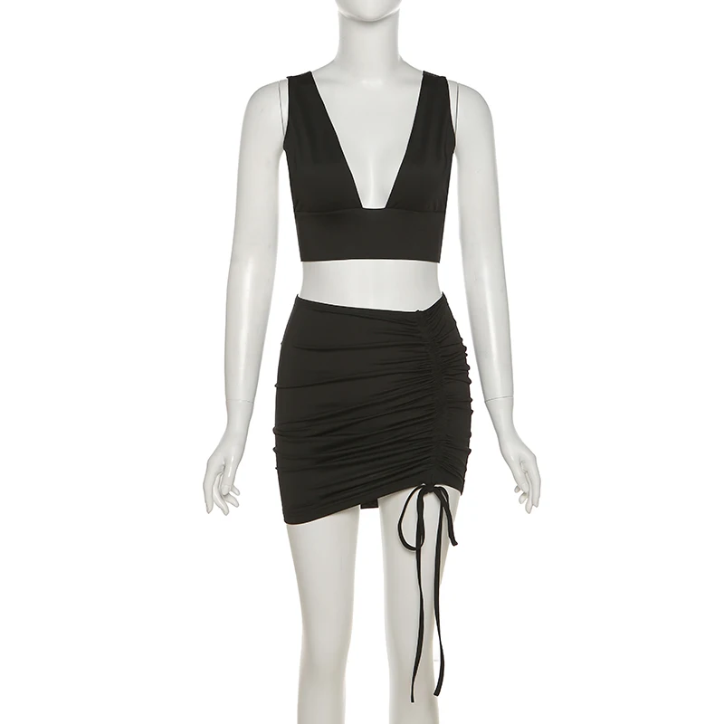 Женский костюм из жилета и юбки wsevypo, однотонный комплект из двух предметов, летний укороченный топ на бретельках с глубоким V-образным вырезом и юбка с рюшами и шнуровкой