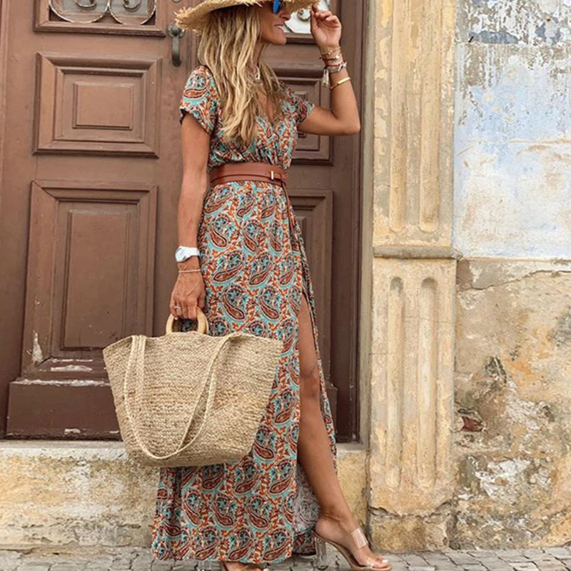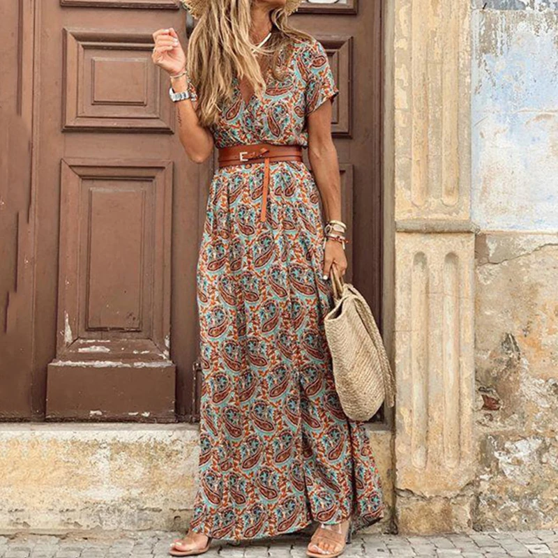 Женское длинное платье в стиле бохо, элегантное пляжное платье с V-образным вырезом, коротким рукавом и поясом с принтом и широким подолом, 2021