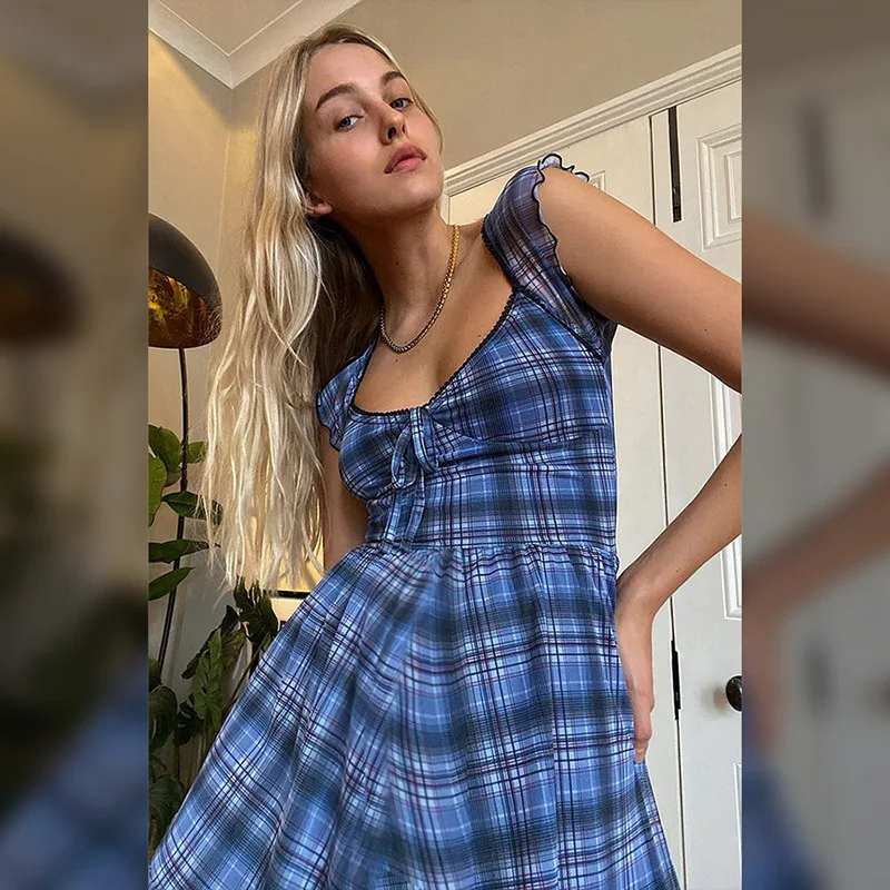 Летнее мини-Y2K, сексуальное женское платье, в клетку, со шнуровкой...