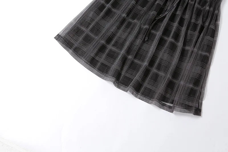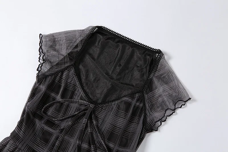 Y2K EGIRL E-girl эстетичное клетчатое Сетчатое черное платье с принтом Y2K модное прямоугольное мини-платье с коротким рукавом Двухслойное ТРАПЕЦИЕВИДНОЕ