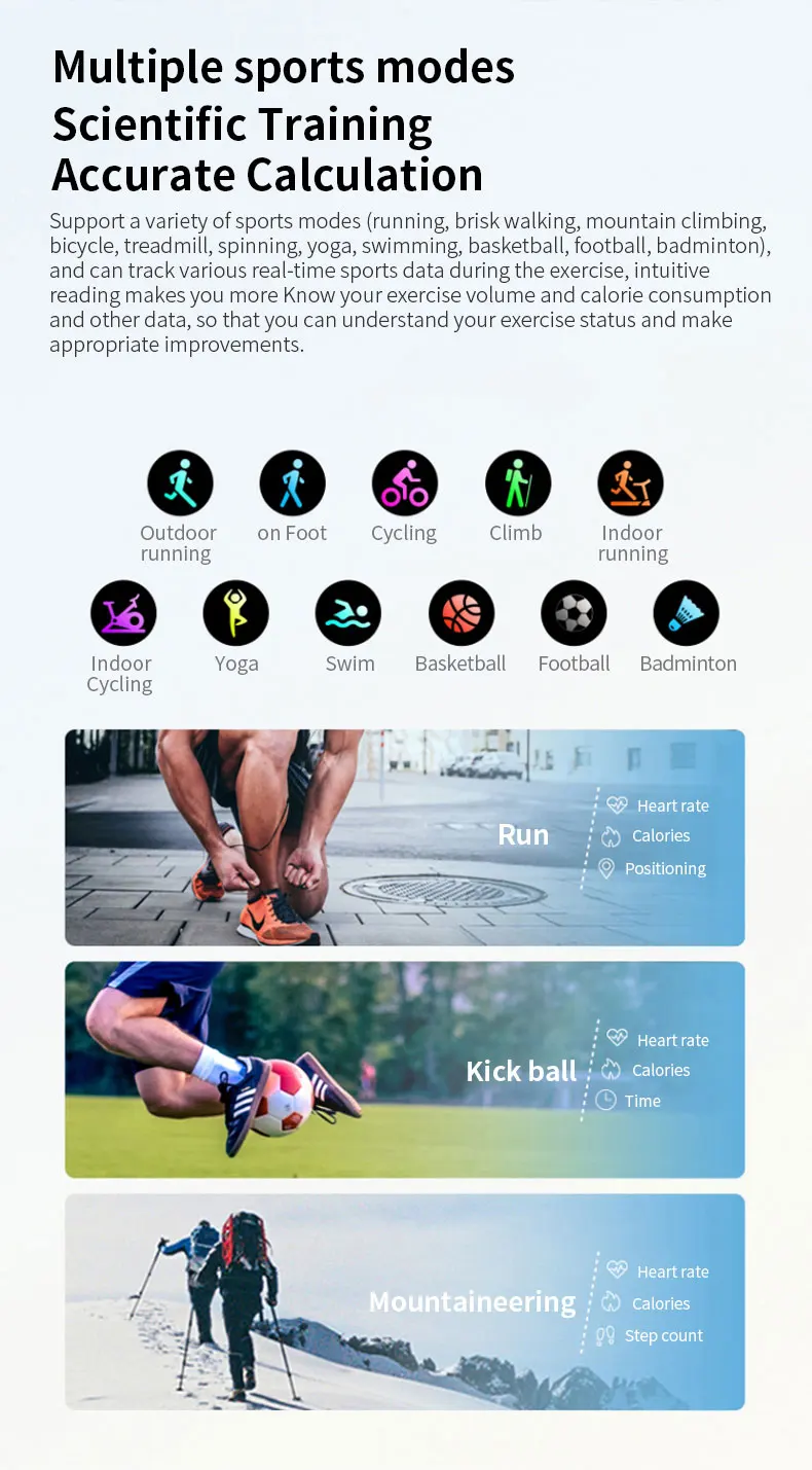 Поддерживает различные спортивные режимы и может отслеживать различные спортивные данные в реальном времени во время упражнений, интуитивное чтение позволяет вам больше узнать объем упражнений, потребление калорий и другие данные, чтобы вы могли понять свой статус упражнений и улучшить их качество