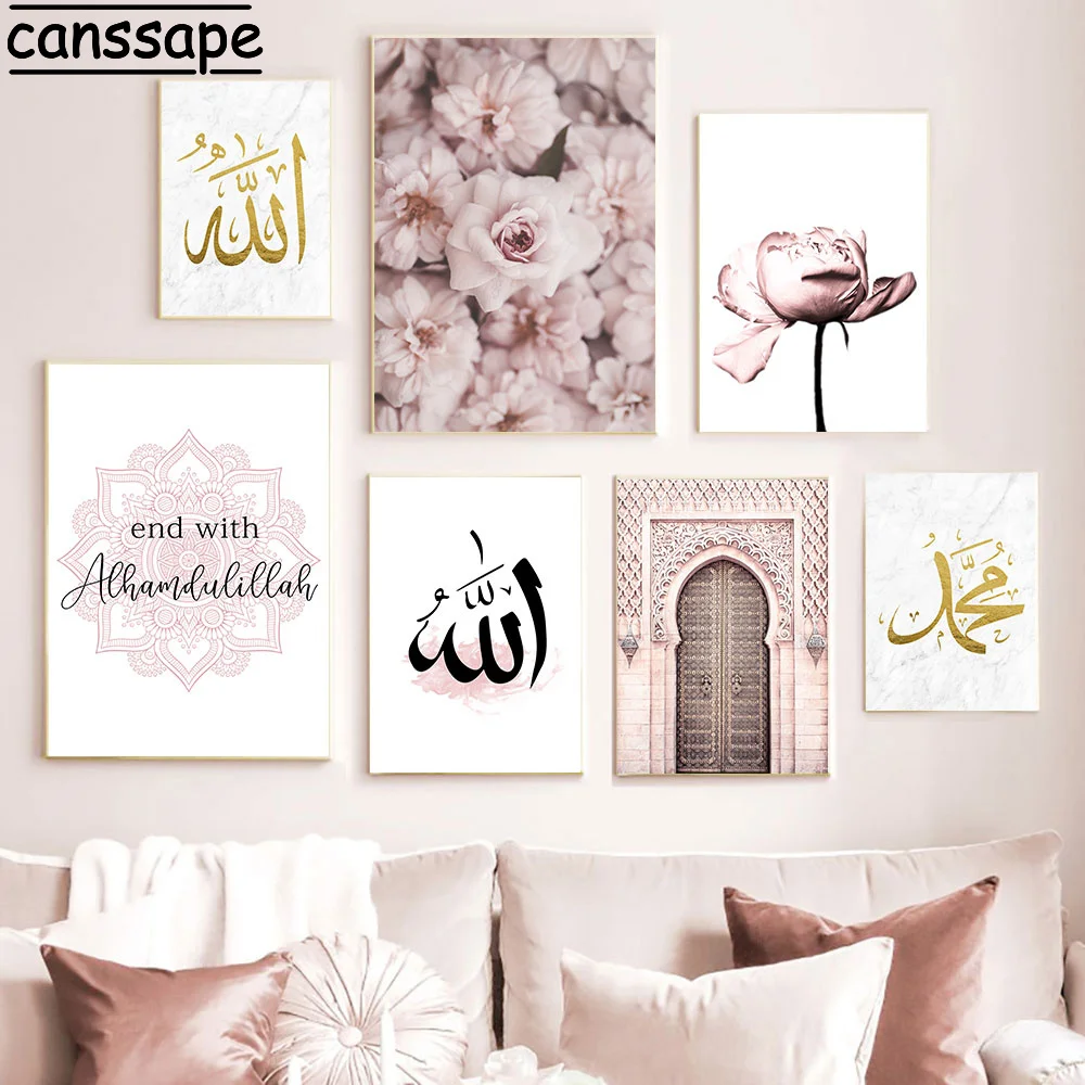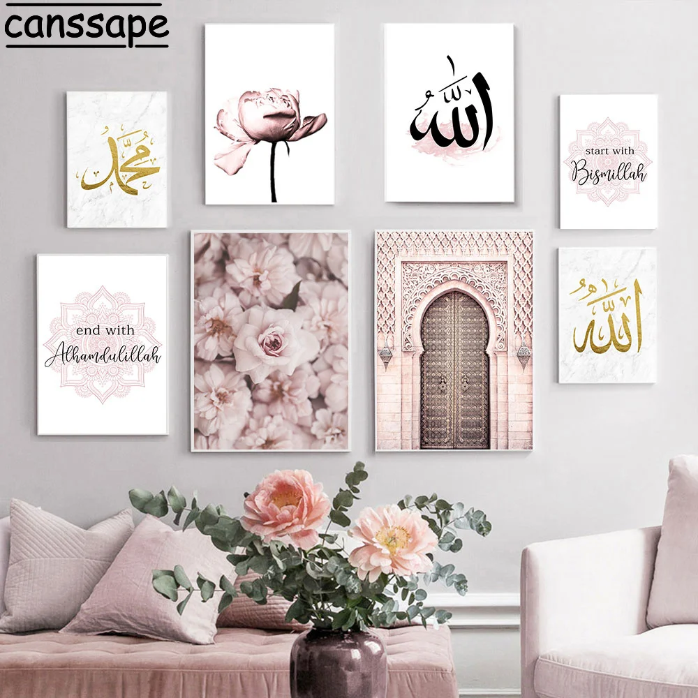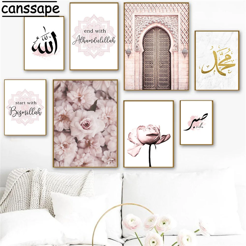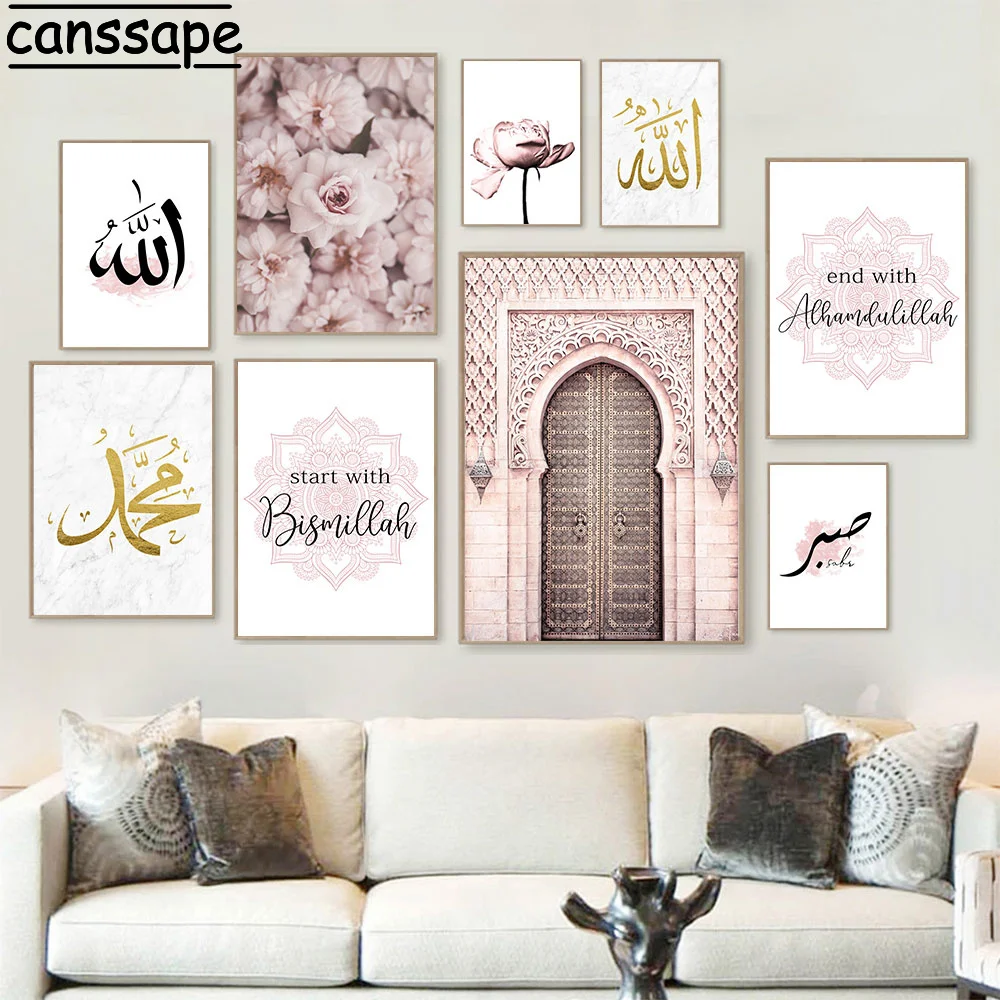 Розовая фотография, искусство Аллах Бисмиллах, художественные принты, мусульманская стена, марокканская дверь, декор для гостиной