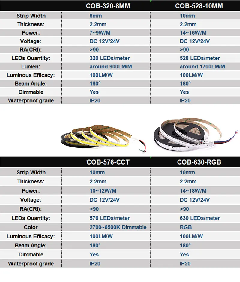 Светодиодный чип: SANAN originalДлина: 5 м/рулонШирина COB: 5 мм, 8 мм, 10 ммРабочее напряжение: 12 В постоянного тока или 24 В постоянного токаМощность: 7-9 Вт/м (320 светодиодов), 10-12 Вт/м (384 светодиодов), 14-16 Вт/м (528 светодиодов)Ра: >90Светильник Цвет: синий, желтый, теплый белый/холодный белый/красный/холодный синий, золотисто-желтыйПрименение: Внутренняя/уличная декоративная подсветка, автомобильное освещение...