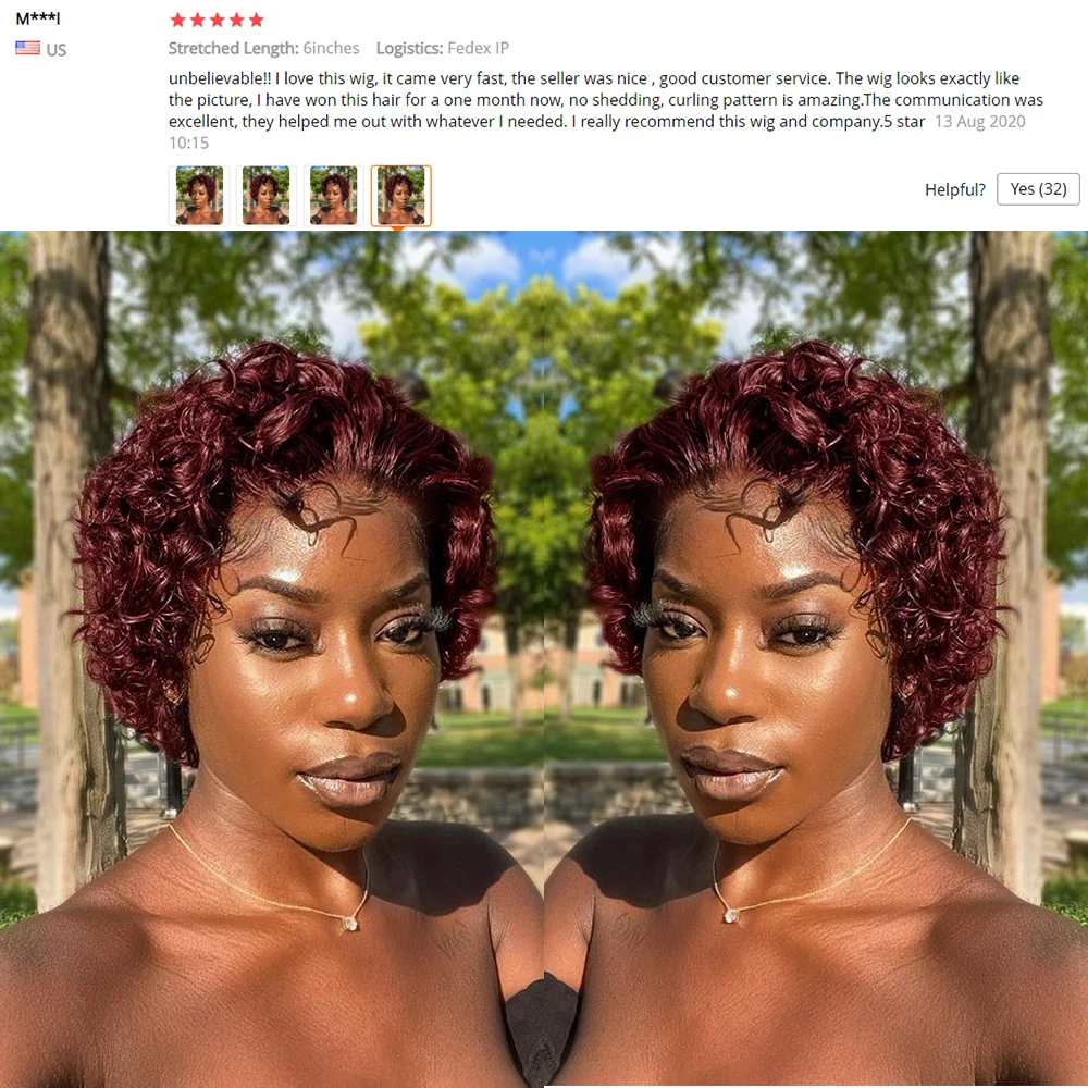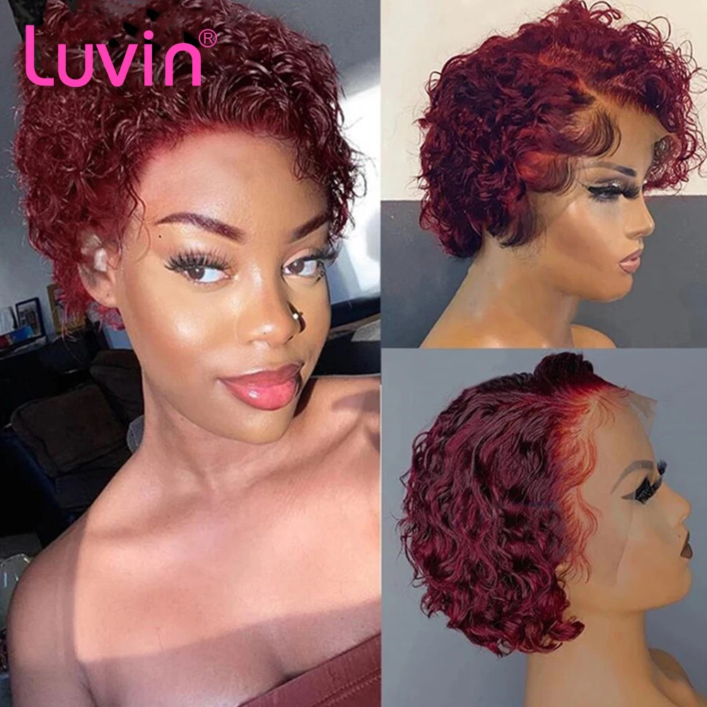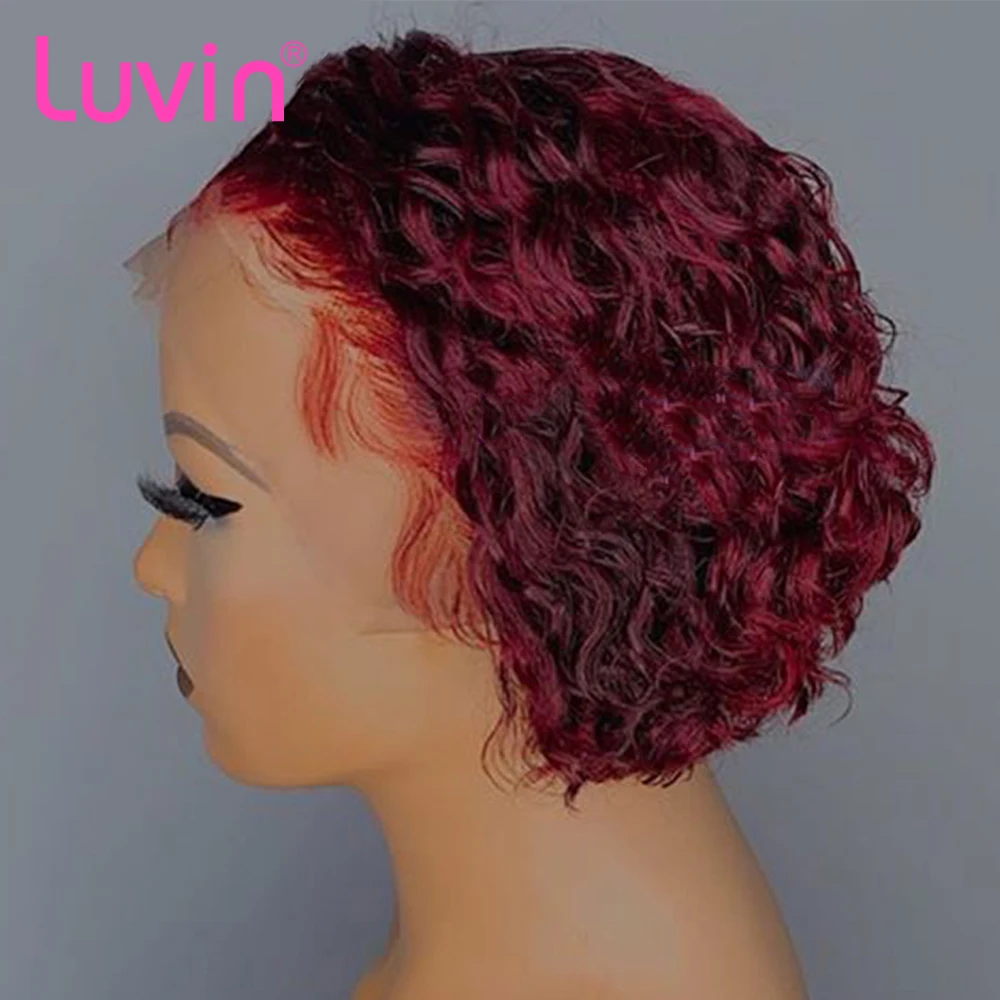 Парик Luvin T, короткий Боб, кудрявый, стрижка Пикси, кружева, парики из натуральных волос для женщин, глубокая волна, бордовый, 99J