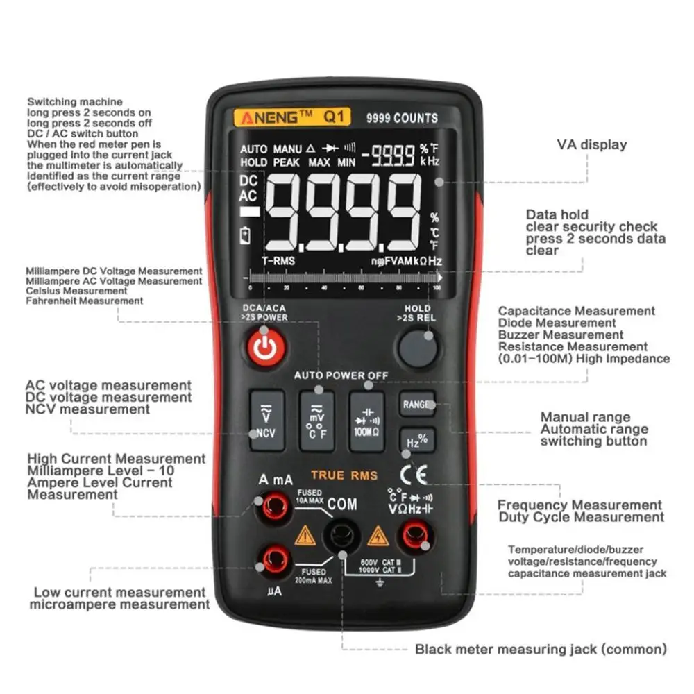 Дополнительные сведения: мультиметр в основном предназначен для измерения, может точно измерять напряжение переменного и постоянного тока, переменный и постоянный ток, также может использоваться для измерения сопротивления и температуры, испытания на непрерывность и испытания диодов. Легко работать, автоматическое определение точного измерения с самокалибровочным чипом, чтобы убедиться в точности и стабильности. Цифровой ЖК-дисплей с подсветкой, удобно измерять и считывать данные в темной среде, а также измерительные данные до 9999 подсчетов. Отлично подходит для ремонта электроники, обнаружения автомобильного постоянного тока, ремонта прибора, фабрики, школьной лаборатории, домашнего хобби, ремонта машины и т. д. вы получите 1 мультиметр и 1 тестовый провод с датчиком температуры. Поставляется с сумкой для хранения, легко хранить и переносить.