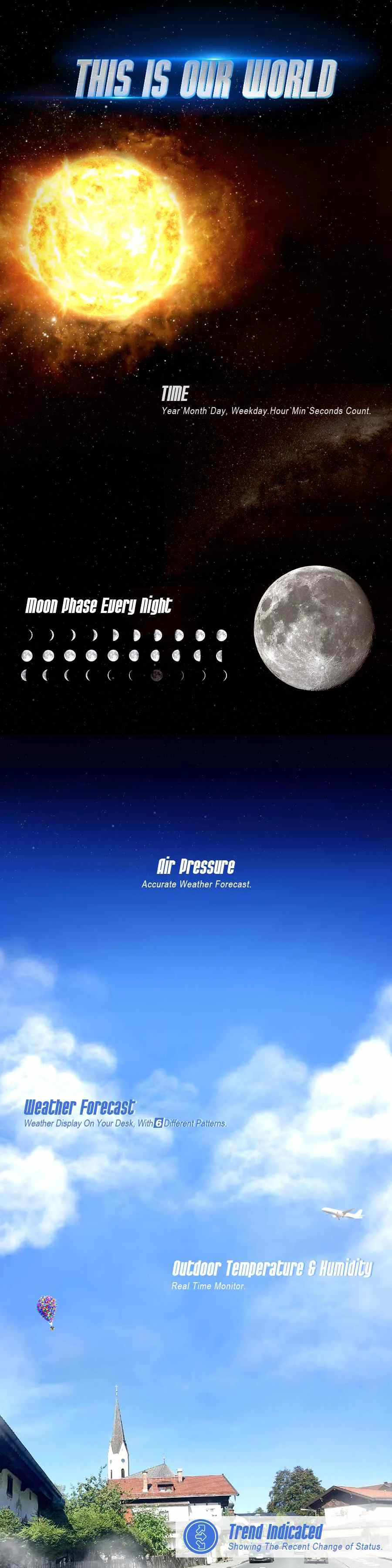 Барометр и прогноз погоды:-Прогноз погоды: солнечная, частично облачная, облачная, дождливая, штормовая.-Диапазон барометра: 800hpa ~ 1100hpa.-Нажмите и удерживайте кнопку «вниз», чтобы переключить блок барометра hPa/mB или inHgUsb-порт:Сзади есть круглое отверстие TH8888pro. Подключите его с помощью usb-кабеля с компьютером или штепсельной вилкой для создания вечной подсветки.Это будет лучшим партнером на вашем столе.
