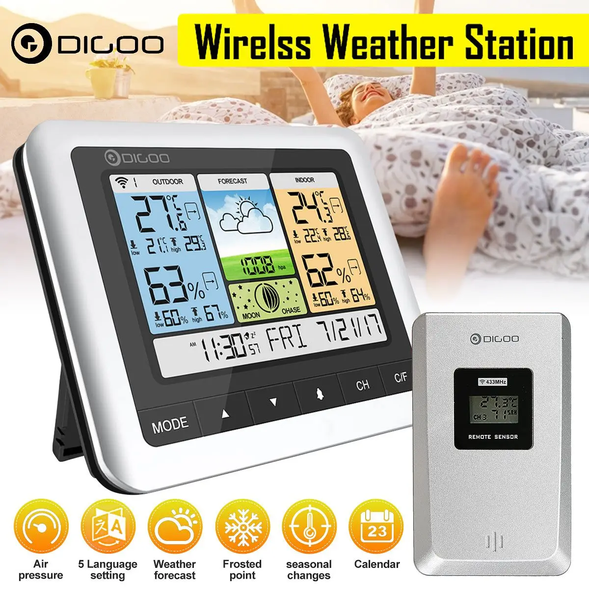 Digoo DG-TH8888 Крытый Беспроводной Погодная станция термометр влажности Сенсор погоды Сенсор будильник Дата Подсветка