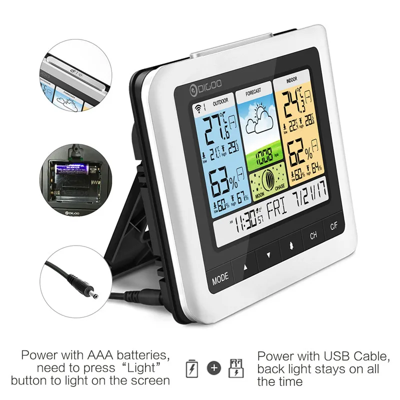 Посылка включает в себя:1 xDigoo DG-TH8888Pro цветная Беспроводная настольная метеостанция1 xБеспроводной наружный датчик Digoo DG-TH8888Pro (Питание от 2 батарей xAAA)(Поддержка до 3 сенсоров, больше датчиков доступны для заказа в ближайшее время для клиентов, которые имеют много места для измерения потребности :)1 xDigoo DG-TH8888Pro руководство пользователя на английском языке1 xСпециальный usb-кабель питания Digoo DG-TH8888Pro (требуется всего 5 в 1 а)1 xDigoo DG-TH8888Pro оригинальная цветная подарочная упаковка