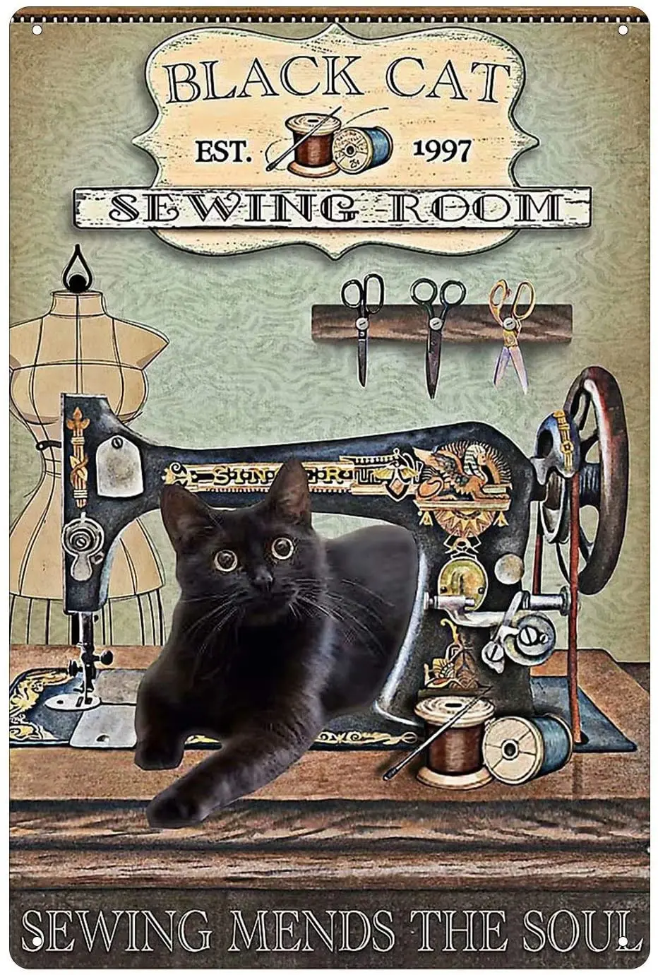 Металлический плакат с черной кошкой Est.1997 для шитья комнаты, шитье, замена души, жестяной логотип, плакат, Украшение стен для дома, кафе