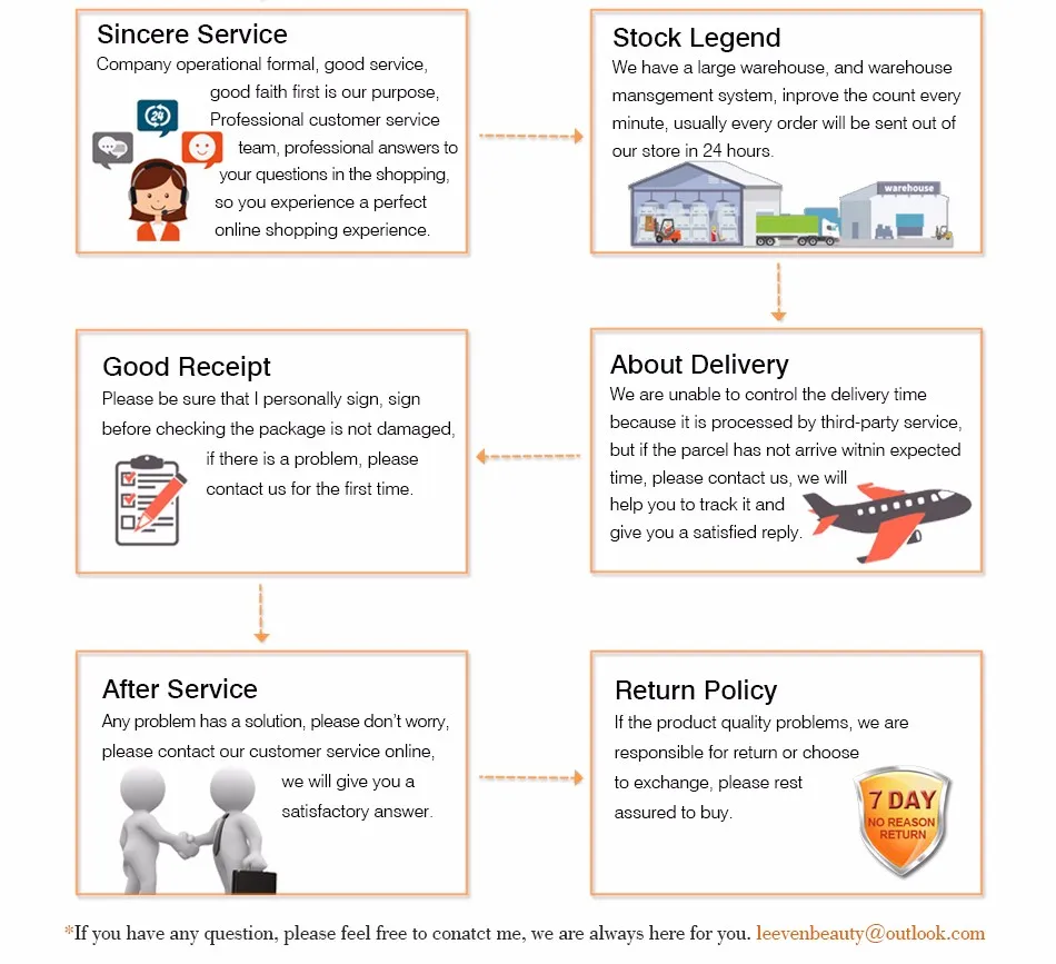 1. Пожалуйста, сохраняйте правильный адрес и ваш телефон в комплекте, чтобы не создавать проблем.2. Мы продаем напрямую с фабрики, для получения оптовой цены, пожалуйста, свяжитесь с нами напрямую.3. Стандартная доставка обычно занимает 15 дней, но некоторые могут занять меньше и больше времени, пожалуйста, свяжитесь с нами, если у вас есть какие-либо сомнения относительно статуса доставки.4. Мы готовы предложить высококачественное обслуживание, пожалуйста, оставьте положительотзывы отзыв с 5 звездами при получении вашего заказа, если они вам нравятся. Сохраните наш магазин и получите скидку или бесплатные подарки в следующий раз.5. Спасибо, что посетили наш магазин, хорошего вам дня.