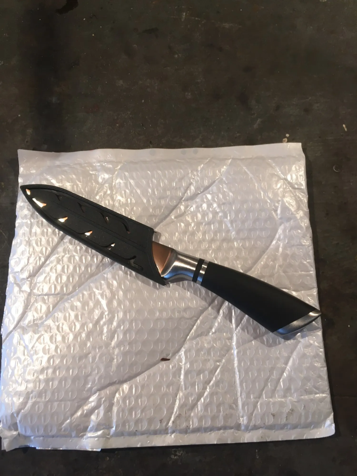 доставили аккуратно и быстро. лезвие еще надо доводить до максимально острого. чехол на лезвие в комплекте, но похоже, от другой модели ножа