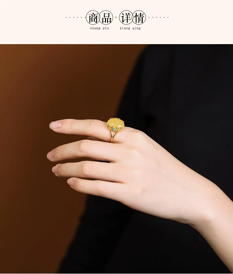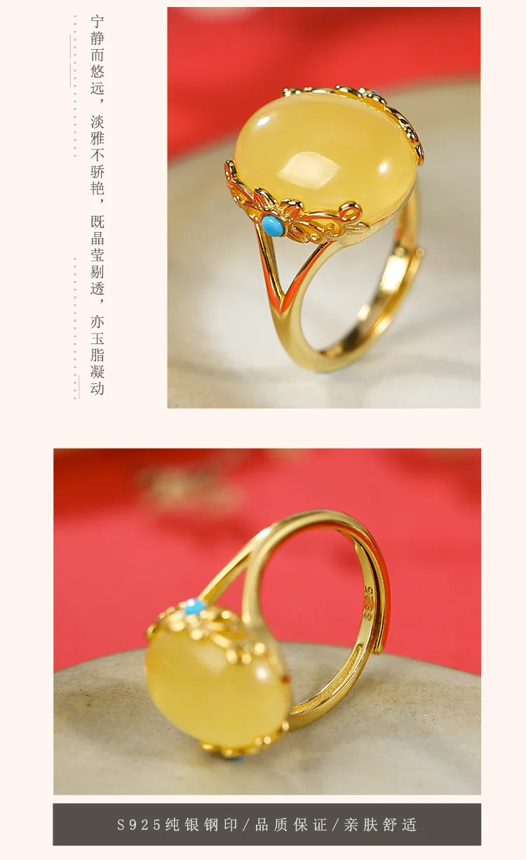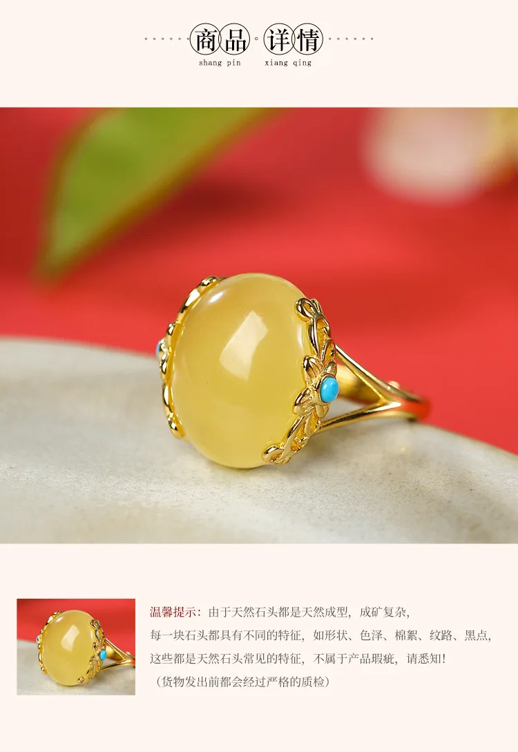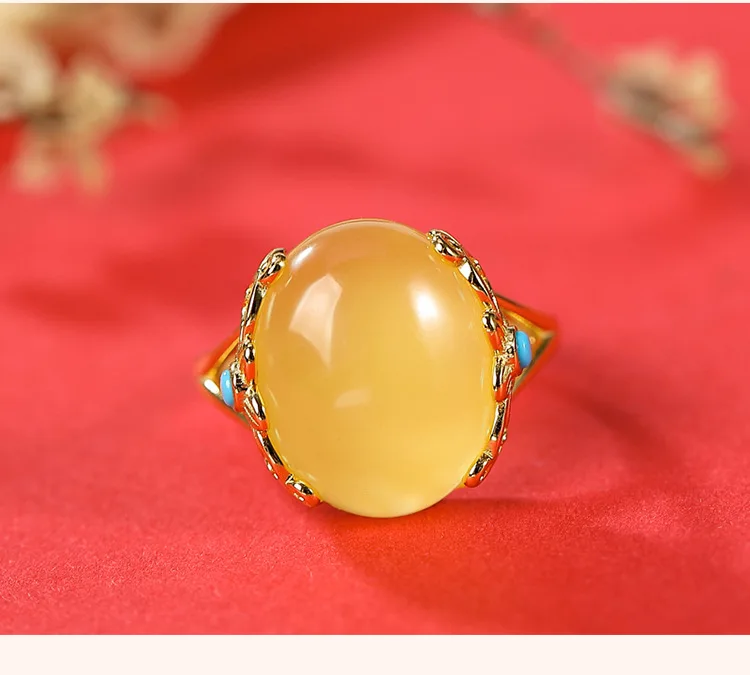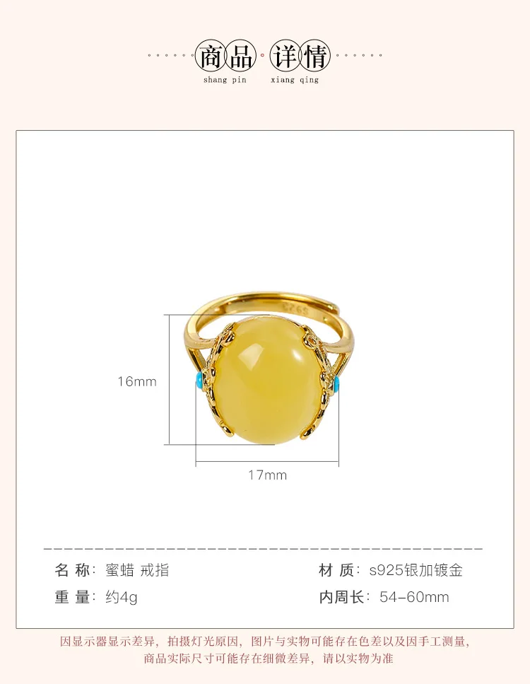 Новинка кольца из серебра S925 пробы с позолоченной вставкой из натурального Янтарь из воска трендовые элегантные женские регулируемые Открытые Кольца K0095