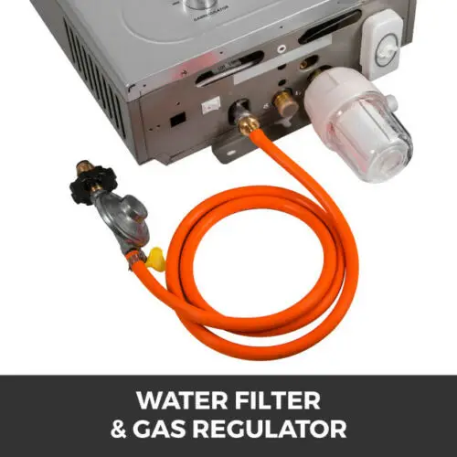 Мы предоставляем Газовый Регулятор пропана со шлангом для более легкого подключения к бензобаку. Размер соединителя: 5/8 ". Этот водонагреватель RV пропан также имеет фильтр для воды, чтобы дать вам чистую и мягкую воду для принятия душа.